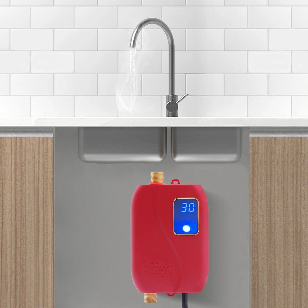 Specifications Model: XY-FC Color: Red Style: Modern Shape: Rectangle Material: Brass, ABS, 304 Stainless Steel, 316L Stainless Steel Surface Treatment: Pickling Plug: US-Standard Power Source: Corded Electric Water Inlet Mode: Bottom Water Inlet Mounting Type: Wall-Mounted, Floor-Mounted, Under Sink Temperature Regulation Range: 20-50°C/68-122°F Power Cord Length: 1.05m/3.44ft Assembly Required: Yes Number of Items: 1 Power: 3000W Voltage: AC 110V Frequency: 50-60Hz Waterproof Level: IPX4 Water Pressure: 0.04-1.2MPa Wire Request: Wire Cross Section ≥2.5mm²/0.0038in² Suggest Minimum Reserved Installation Space: 30*30*25cm/11.81*11.81*9.84in Gross Weight: 1.1kg/2.42lbs Net Weight: 0.95kg/2.1lbs Product Size: 11.6*7*19.5cm/4.57*2.8*7.68in Tank Length: 16cm/6.3in Package Size: 23.5*9.5*18.5cm/9.25*3.74*7.28in Package Included 1*Water Heater 1*English Manual All Accessories for Assembly Notes Please carefully read the manual and strictly follow the precautions to have a better experience. Please note that this product only supports vertical installation, as horizontal installation may cause dry burning. And ensure to add water before connecting to the power supply during the first use. This product is recommended to be connected with wires with a cross-sectional area of ≥ 2.5 square millimeters, and connected to trip switches of over 32a for use. If the water flow decreases, please check if the filter element is blocked. Please allow the slight color difference caused by the shooting light and 1-3cm error due to manual measurement, and make sure you do not mind before you order. Application It is very suitable for installation in small residential areas, garages, offices, sinks, kitchens, apartments, bathrooms, RVs, terrace sinks, and other areas that require hot water but have limited space. It is suitable for different water pressures in different regions and can also be used in high-rise households. High Efficient: With the joint efforts of a 3000W power and a fast thermal conductivity heating pipe, it can provide you with uninterrupted hot water within 3-5 seconds of the faucet being turned on. Clear Temperature: When turned on, you can long press the power button for 6 seconds to set the unit between Fahrenheit or Celsius degrees, allowing people accustomed to different units to quickly determine the current temperature.