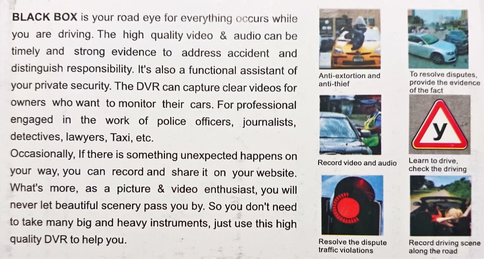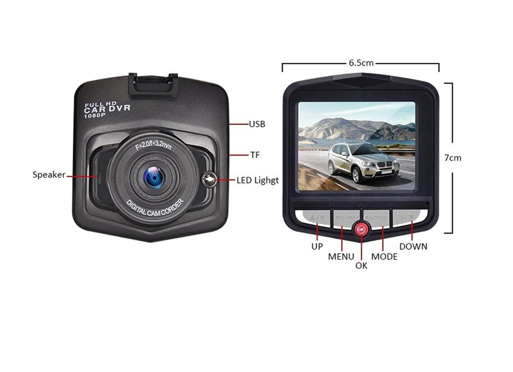 Mini Full HD Dash Cam Car Video Recorder DVR Camera Motion Detection Sensor Specifications: Type: Monitor - Recorder + Built-in Front Camera Night mode: IR diodes Compatibility: Universal Car Product Lens: Wide angle with high resolution Display: TFT LCD RGB color Signal systems: PAL / NTSC Photo format: JPEG photos Photo resolution: HD High Quality Video format: AVI video Video resolution: FULL HD 1920x1080P Front camera range: 170 degrees Supports AV OUT, HDMI OUT - it is possible to connect to a TV, via a cable "Motion detection" function - recording when motion is detected Slot for Micro memory card: 32GB (the card is included in the set) Easy installation: Stand (included) Battery: built-in rechargeable Power supply: DC 12/24V, DC5V, 400MA Dimensions: 6.8 x 7.3 cm The position 3 button stated in the manual included in the kit is not present on the actual item. The memordy card needs to be formatted before use,otherwise it will show up as full. Perfect For Video Evidence, Recordings and Sharing of Interesting Situations on the Road. Package includes: 1x Video Recorder 1x Mounting Stand 1x 32 GB Memory Card Mini Full HD Dash Cam Car Video Recorder DVR Camera Motion Detection Sensor Type: Monitor - Recorder + Built-in Front Camera Compatibility: Universal Car Product Lens: Wide angle with high resolution Photo resolution: HD High Quality Video resolution: FULL HD 1920x1080P Supports AV OUT, HDMI OUT - it is possible to connect to a TV, via a cable "Motion detection" function - recording when motion is detected Slot for Micro memory card: 32GB (the card is included in the set) Easy installation: Stand (included) Power supply: DC 12/24V, DC5V, 400MA The position 3 button stated in the manual included in the kit is not present on the actual item. The memordy card needs to be formatted before use,otherwise it will show up as full. Perfect For Video Evidence, Recordings and Sharing of Interesting S