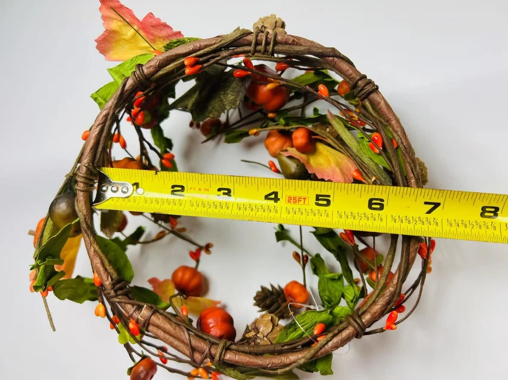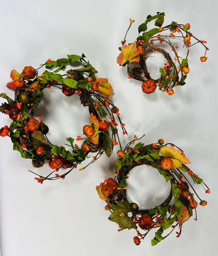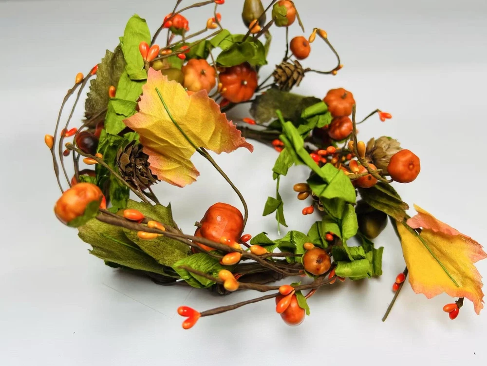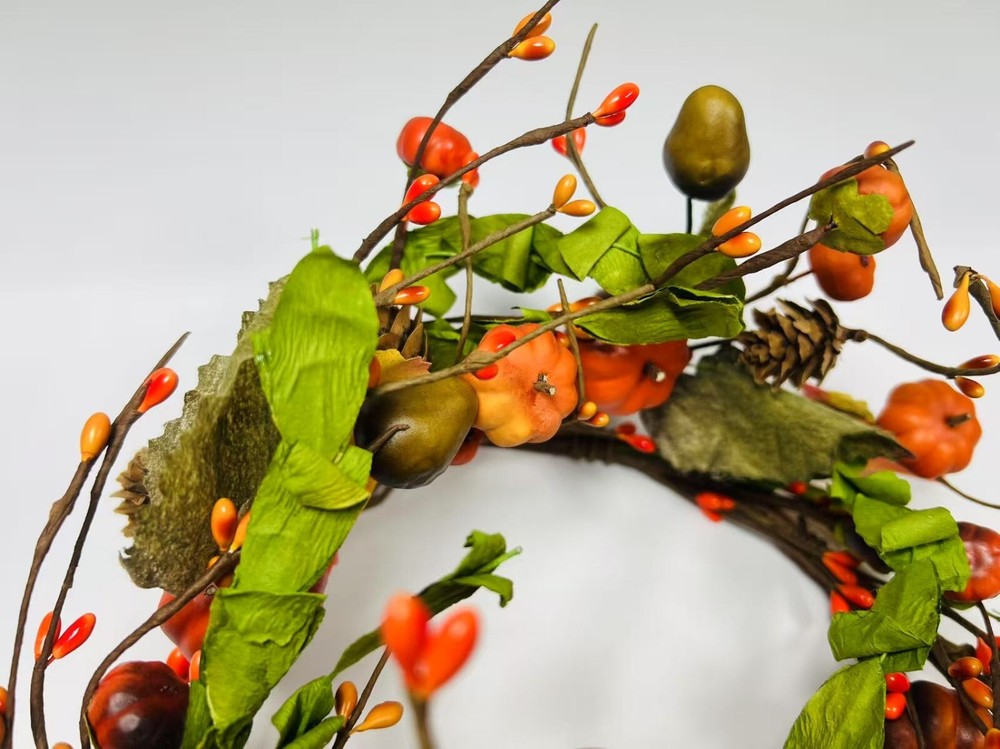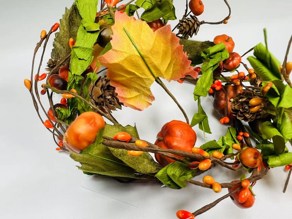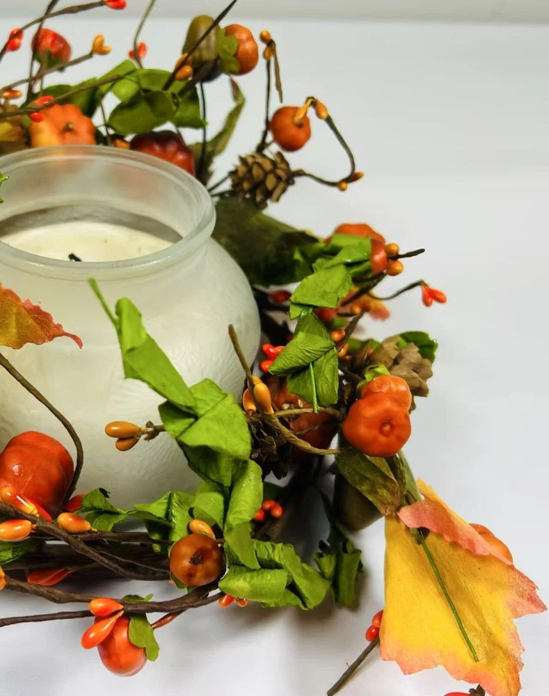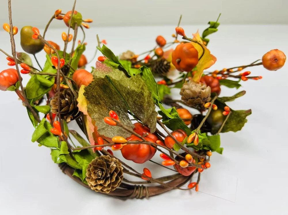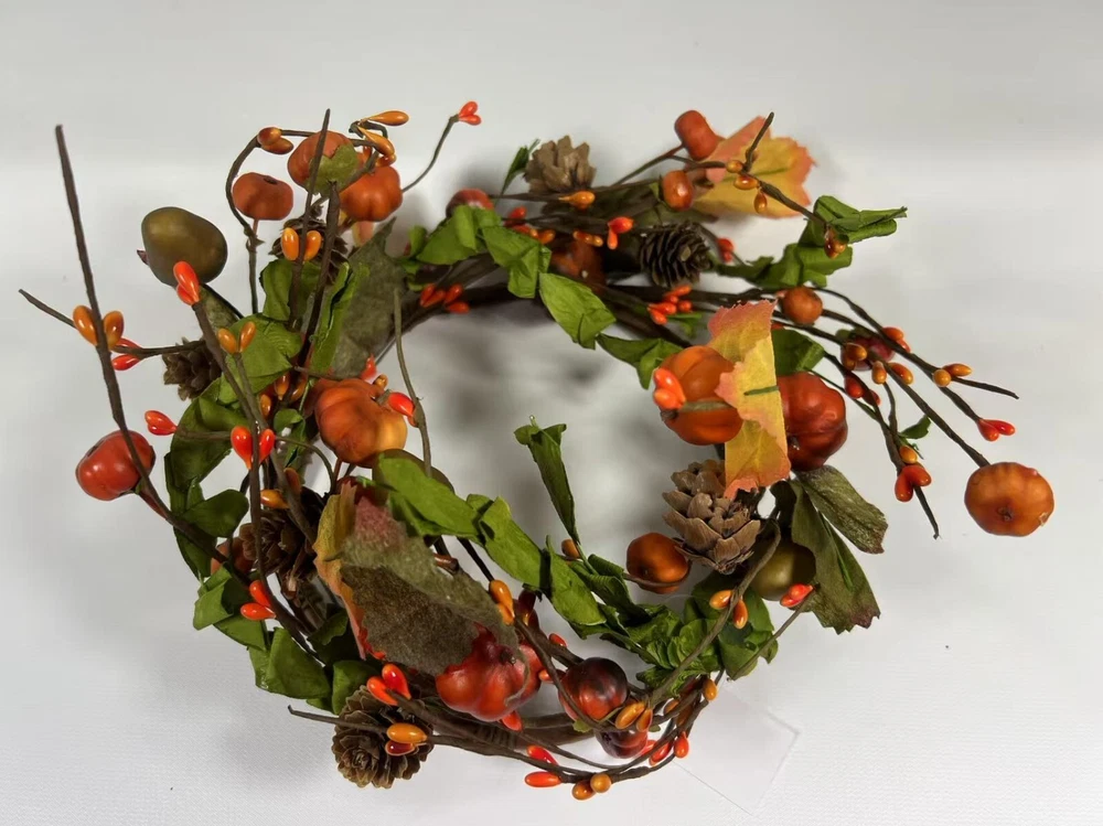 Add a festive touch to your fall decor with this beautiful artificial candle ring featuring lifelike mini pumpkins, berries, pinecones, and colorful fall leaves. Perfectly sized to fit 6.5” candles, it makes a charming centerpiece or accent for mantles, dining tables, and shelves. Crafted with flexible brown-wrapped wire for easy shaping. A great addition to your rustic farmhouse Thanksgiving setup.