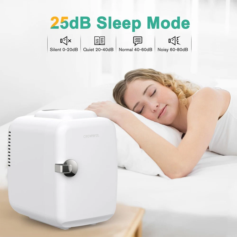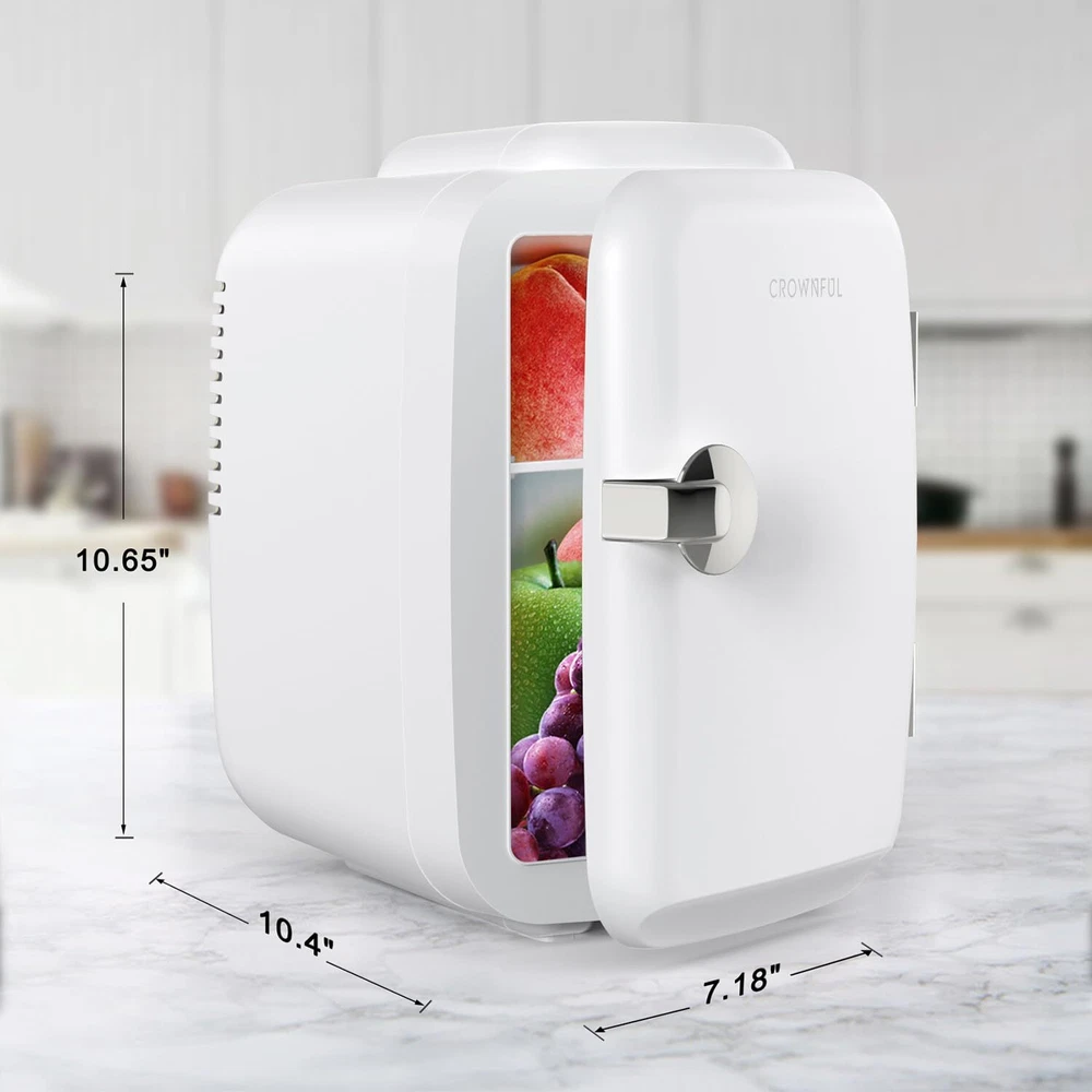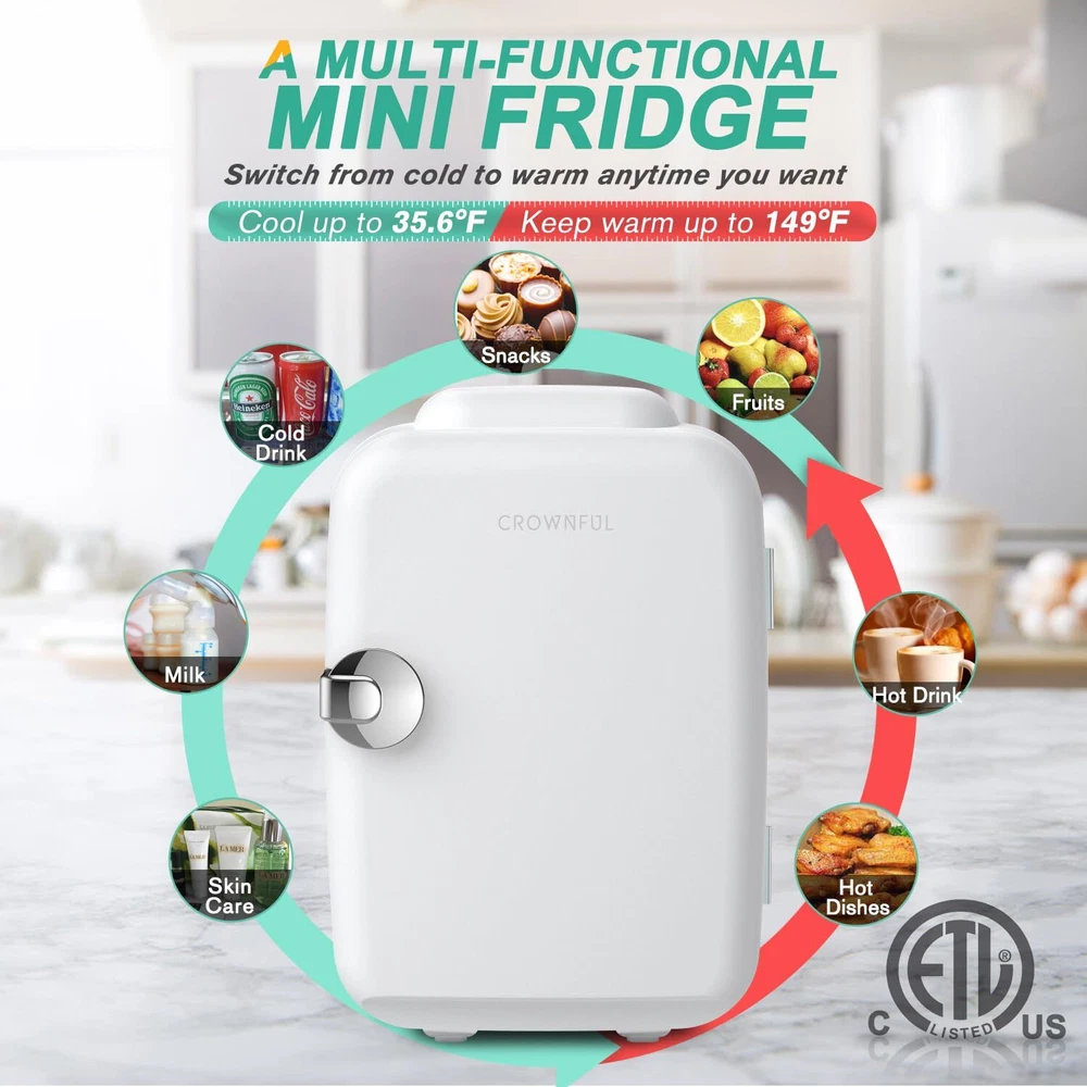 [Multifunctional Mini Fridge] An excellent little device for storing food, drinks, beer, snacks, breast milk, cosmetics, and skincare products. This is the perfect present for women because it also functions as a personal skin care fridge [Compact and Portable] The mini fridge has a 4-Liter capacity that can store up to six 12 oz. soda cans. The interior size is 5.33x6.05x7.96 inches. It comes with a convenient carry handle and a detachable shelf, making it simple to transport. Excellent for use in bedrooms, offices, dorm rooms, road trips, boats, campgrounds, and more [Cooling and Warming] Simply flip a switch to cool or warm the refrigerator! On the internal thermostat, it may maintain a temperature of up to 149°F (65°C) or cool down to 35.6°F (2°C) below the surrounding temperature. Really simple to operate and use [Super Quiet Operation] The brush-less high-grade fan motor in the portable electric cooler & warmer fridge can operate silently (25 dB Sleep Mode) and last longer than ever [Versatile Power Options] This skincare fridge includes plugs for both standard home outlets and 12V car chargers. Modern cooling makes the small refrigerator consume less power than most laptops, with innovative safety technology that is ETL certified for long-lasting durability