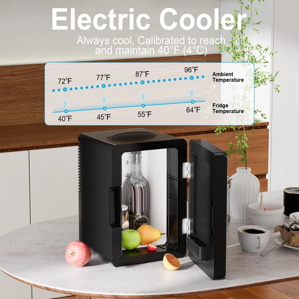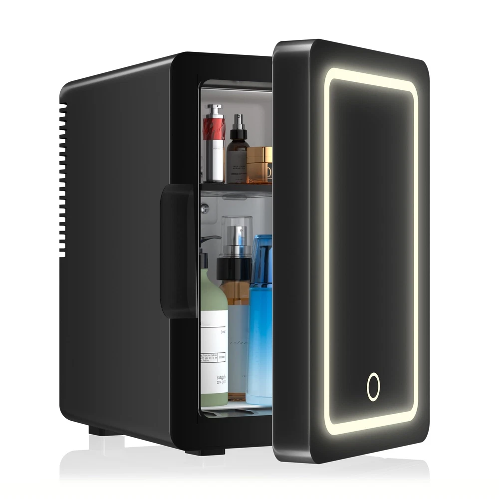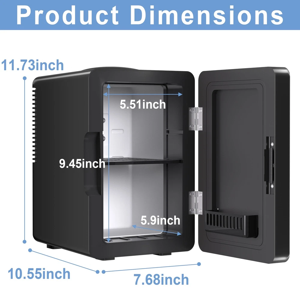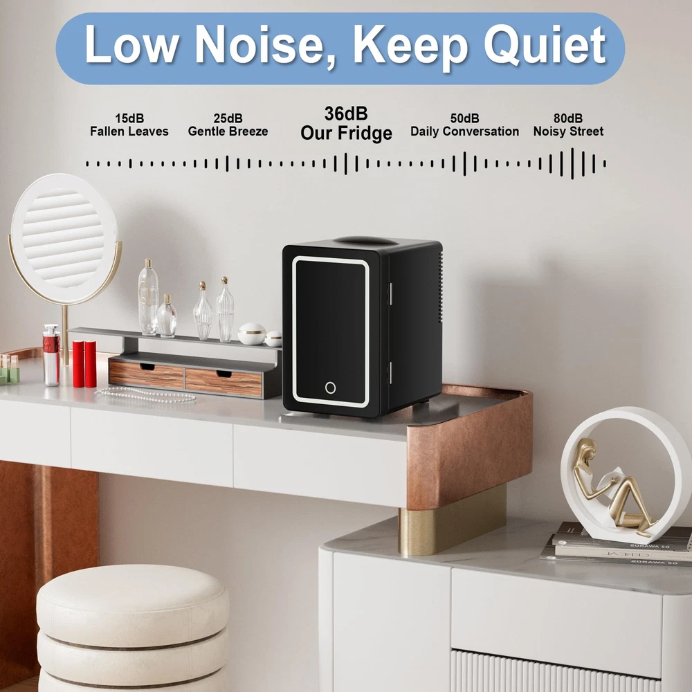 6L Cooling Fridge: This mini refrigerator for skin care and food has a temperature adjustment range of 40°F-64°F(4°C-17°C), always stay cool. An average of 40°F(4°C) is based on 72°F (22°C) indoor room temperature. Calibrated to reach and maintain 40°F(4°C). Not recommended for prolonged storage of perishable items when ambient temperature exceeds 75°F (24°C). Portable Refrigerator: The exterior dimensions of this cosmetic fridge are 10.55” * 7.68” * 11.73”, and the internal dimensions are 5.9” * 5.5” * 9.45”. The personal fridge has a capacity of 6 liters and can easily store 8* 355ml cans or 4* 20oz bottles of water inside. Eco-friendly & Low Noise: The small fridge features advanced aerodynamic fan for more precise temperature regulation, approximately 20% more efficient cooling, 20% less energy consumption, and only 36dB of noise. Suitable for bedrooms, offices and dormitories without affecting your work and rest. Adjustable Shelf & LED Light: This makeup fridge features detachable shelf allows you to easily store beverages, cosmetics and food at different heights. The storage basket on the door is also removable, so you can place items or remove the basket as needed. Product Detail: This compact refrigerator has a ON/OFF switch and power indicator light on the back. Carrying handle on the top makes it easy to move or change positions. Ideal for storing cosmetics, fruit snacks, drinks, and medications. NOTE: If the door doesn’t snap shut when closed, press the door to fully secure it.