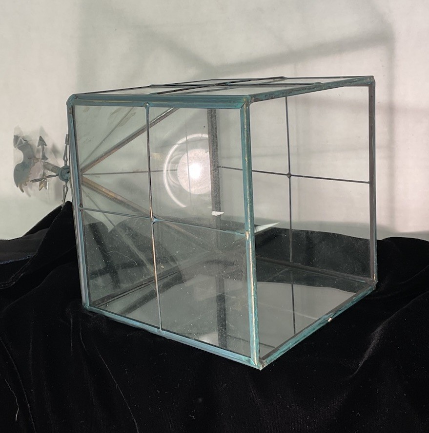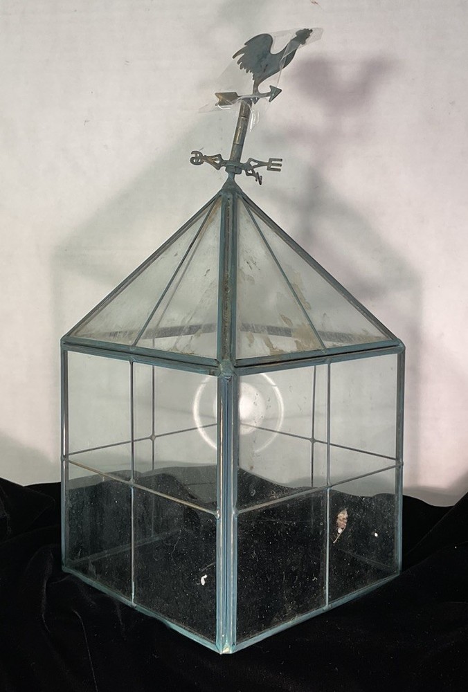 This is a unique glass enclosure for a terrarium or mini greenhouse. Made of metal and glass with a rooster weathervane on top. The weather vane is not attached at present but could easily be attached with superglue. 12” tall. Base is 5” on each side. Bottom is open. See photos