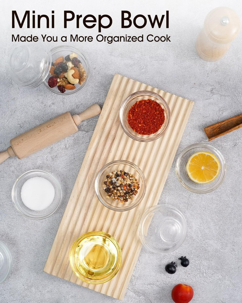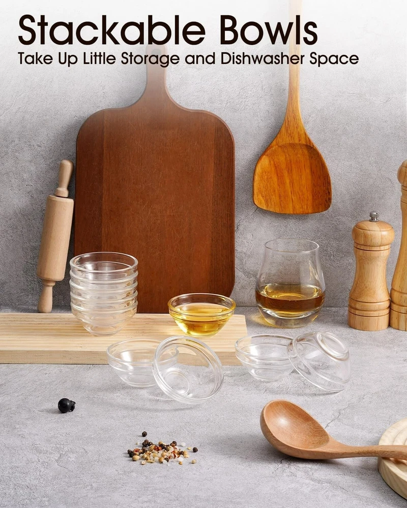 Mini Glass Bowls, 3In 2.5Oz Small Prep Bowl, 10 Pcs Stackable Pinch Bowls for Di About this item: Made You a More Organized Cook: Mini prep bowls is perfect for setting out your ingredients prior to starting cooking, such as small portion of chopped vegetables, herbs, and seasonings, that way you don't forget an ingredient and cut down drastically on mess Great for Personal Dipping Sauces: Measures 3x1.3in, the mini bowl is not too big to crowd your plate but big enough to hold plenty of dip. Each guest can have their own sauce and go to decide how much to use. It's a great presentation move to serve your sauce in a small bowl for a dinner party Great for Reducing Waste: Offering condiments like ketchup, mustard, dips, and so forth in pinch bowls encourages people to use them more efficiently, and looks more aesthetically pleasing Easy to Clean & Stackable: With smooth and nonporous interior, the pinch bowl is easy to clean up by hand or in the dishwasher. Thanks to the wide top and narrow bottom, the bowls can be stacked together very well and are very suitable for small cabinets Clear Glass is Easy to Use: Allows for easy identification of contents and easy to see how much is in it. Besides, it doesn't get those irritating tomato sauce stains or worrying about scratching other surfaces