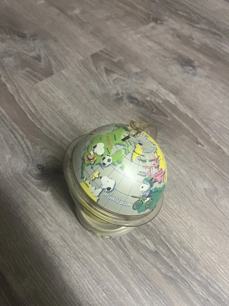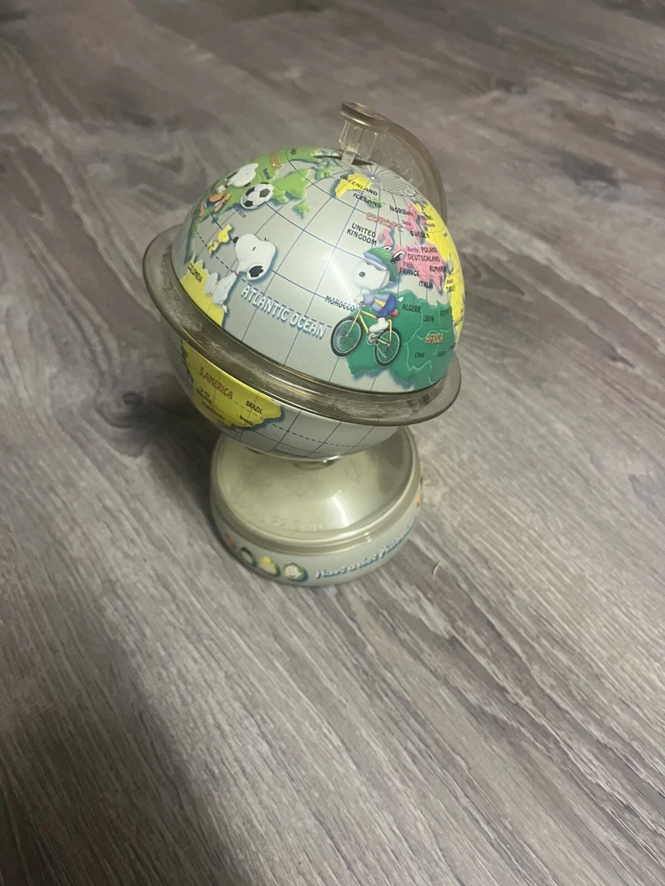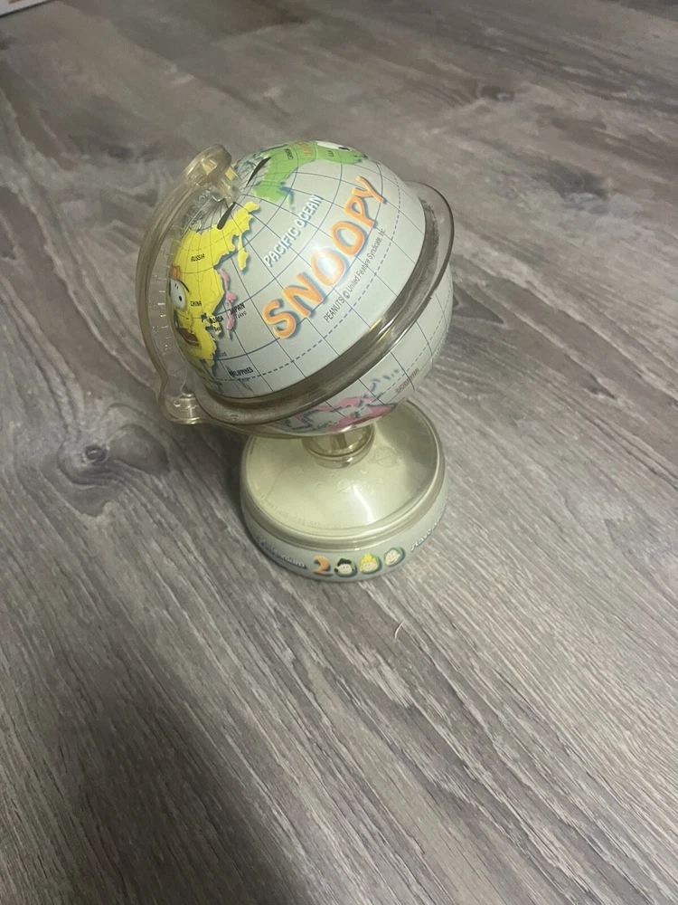 This Mini Globe Coin Bank is a unique addition to any home décor. Made of metal with a plastic stand, this Tabletop Globe spins and features a design of Snoopy. It can hold coins and be used as a decorative accessory. The finish is metallic and the brand is Globe. Perfect for collectors or as a gift, this Mini Globe Coin Bank is a great addition to any room.