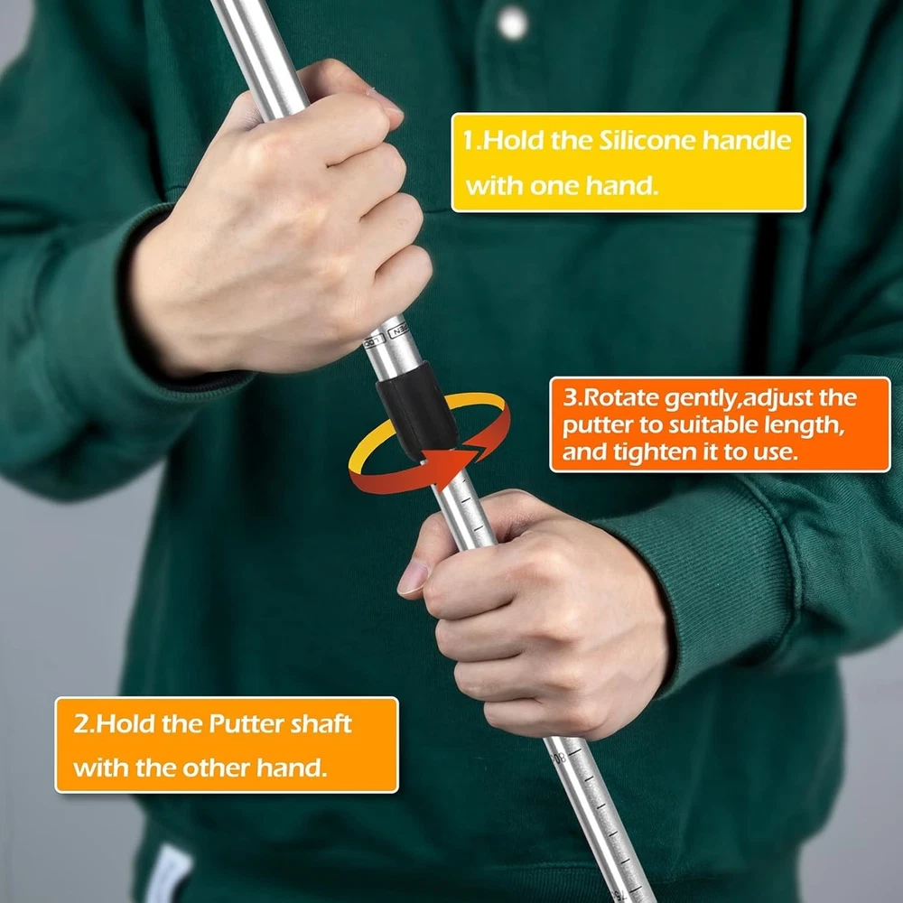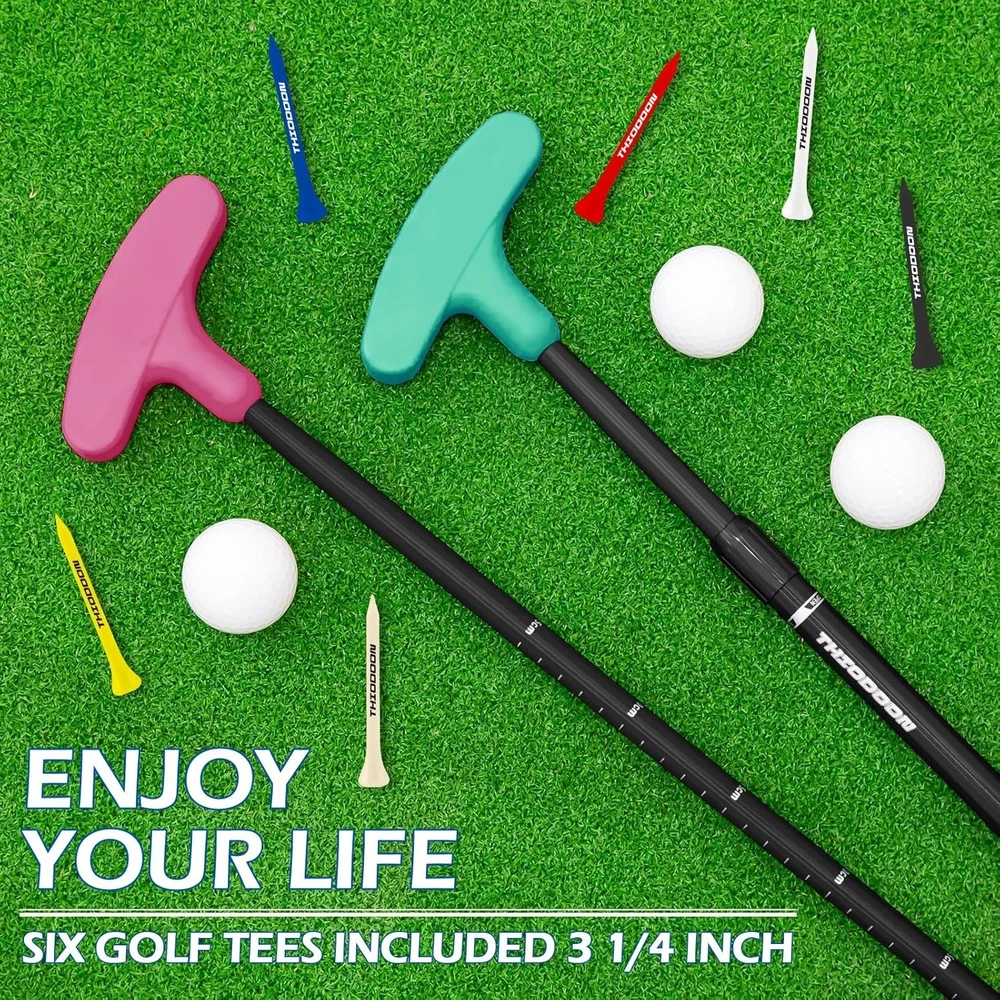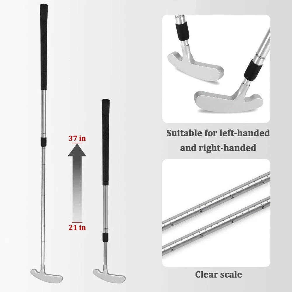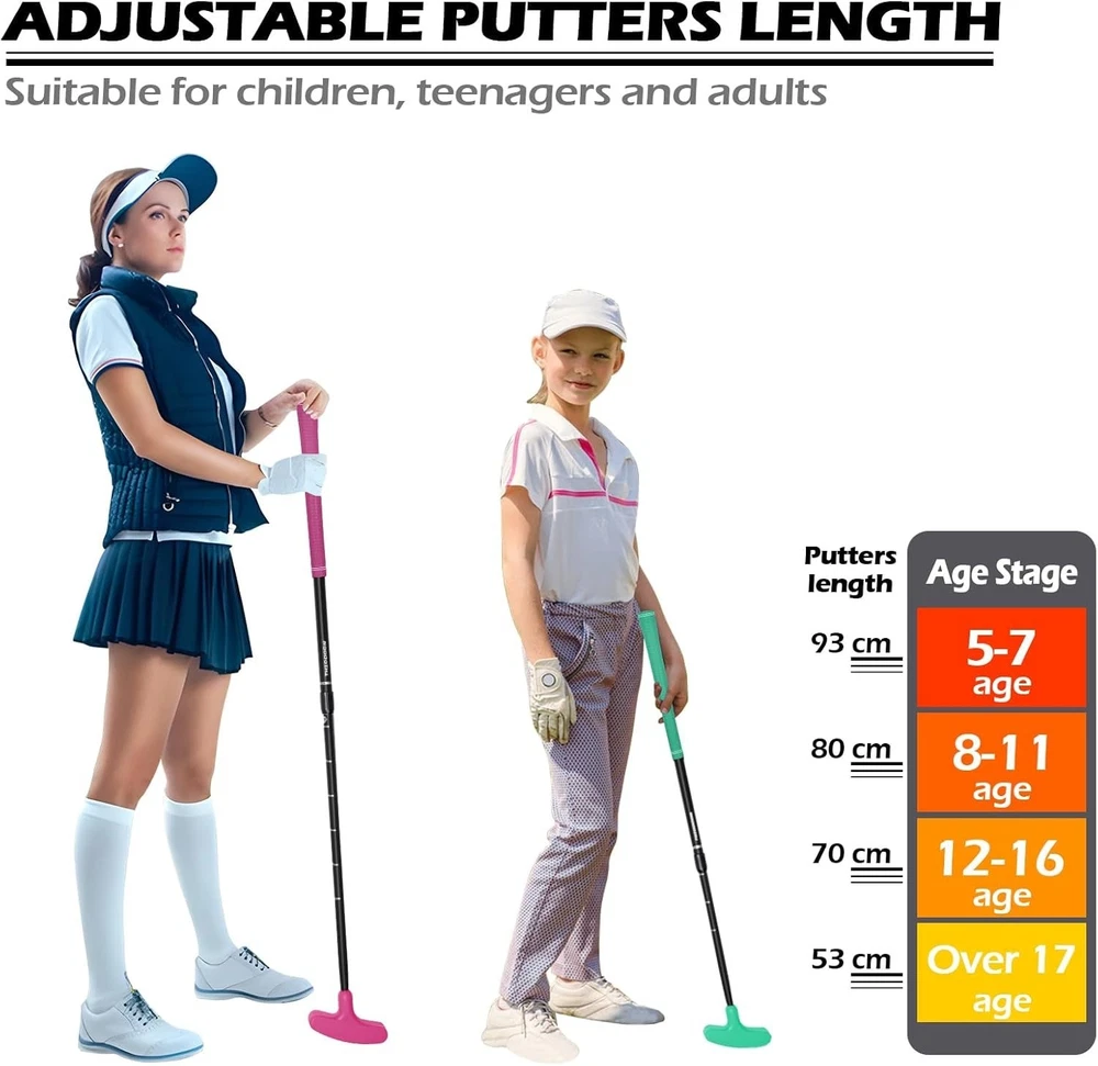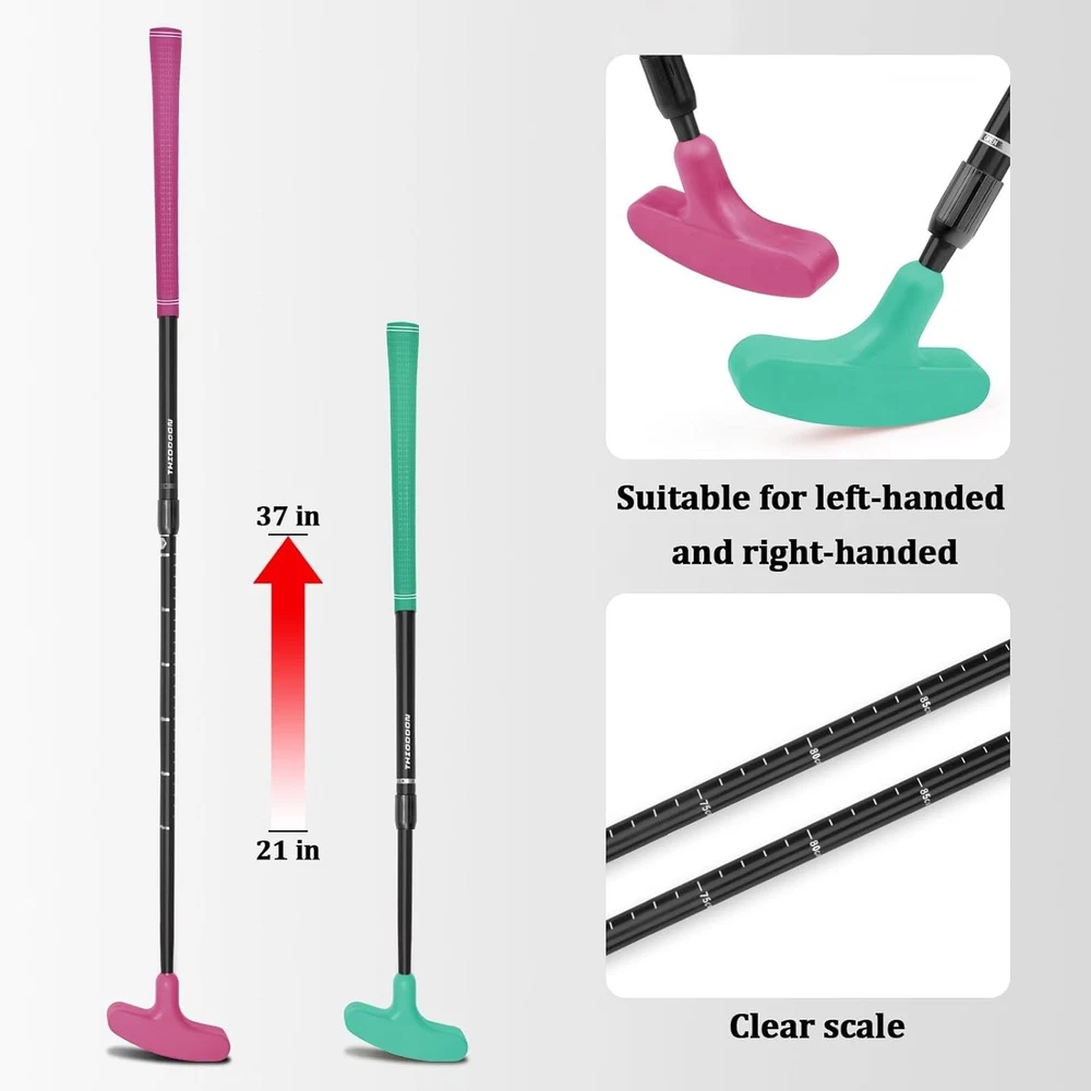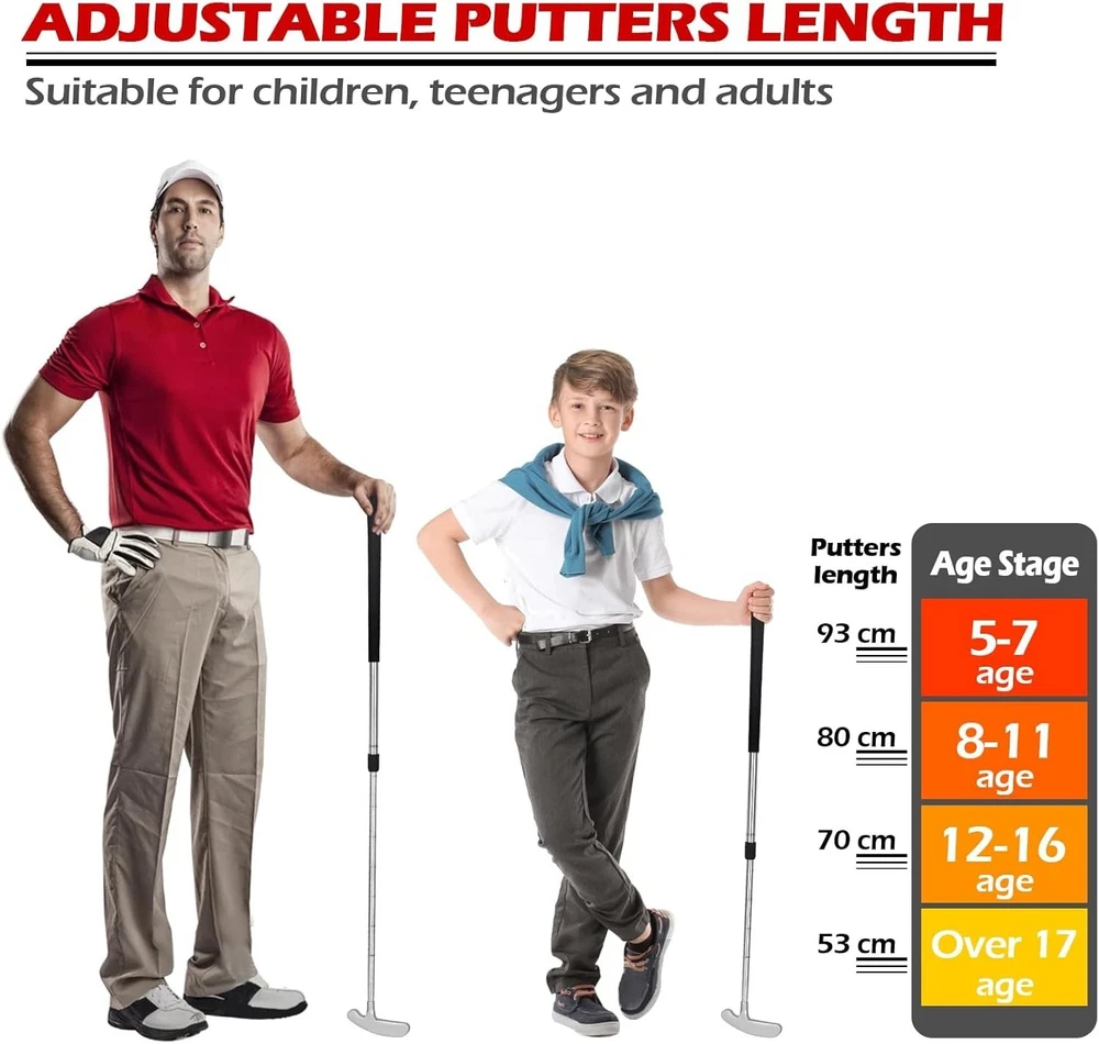 Golf Putters for Men and Women Two-Way Kids Putter Mini Golf Putter for Right or Left Handed Golfers Adjustable Length Golf Putter Suitable for Children, Teenagers and Adults About this item TIMELESS TWO WAY GOLF PUTTER DESIGN:The THIODOON golf putter adopts 2-way cast iron putter designed, It Can Meet the practice needs of different groups of people, suitable for any golfer, whether you are right-handed, left-handed, advanced or beginner, using this two-way golf putters can play your best level. ADJUSTABLE SHAFT FOR ALL AGES:This golf putter adopts an adjustable shaft design for easy placement and storage. You can adjust the shaft length to 21-37 inches (53-93cm) according to your needs. It is suitable for people of all ages, including children and teenagers and adults. RUGGED AND DURABLE HIGH QUALITY MATERIAL:This golf putter adopts high-quality aluminum alloy custom shaft, which has higher hardness, corrosion resistance, solid feel and more durable. The scientific non-slip texture design of the rubber grip makes it more comfortable to hold. The silicone wrap design of the putter head provides more protection, This golf putter can withstand the daily training and practice of outdoor or indoor putting greens and the harsh tests of physical education classes. EASY AND PORTABLE & PRACTICE GOLF ANYWHERE:This golf putter can be adjusted in length, It is light and portable (only weighs about 0.8LB), and can be easily put into a golf bag. You can use this golf putter to practice golf putting in the office, home, balcony, backyard, garage and outdoors to improve your golf skills, reduce work pressure or teach your children to practice putting, and enjoy family happy time in the backyard. UNIQUE AND INTERESTING GIFT IDEAS: This golf putter is the perfect gift for Christmas, birthday, New Year and any other occasions. Suitable for all golfers, it is a good choice for children, teenagers, adults, male and femal