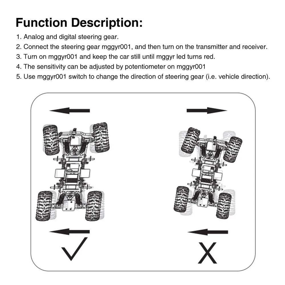 Features: Function: Analog and digital steering gear. Operation: Connect the steering gear Gyro, and then turn on the transmitter and receiver. Turn on Gyro and keep the car still until LED turns red and bright. Sensitivity Adjust: The sensitivity can be adjusted by the potentiometer above Gyro. Change Direction: Using the switch of Gyro, the steering gear can be changed (that is, the direction of the car). Fitment: It is designed for WPL D12 RC car. Specifications: Type: RC Car Gyro Material: Plastic Color: Black Size(L*W*H): About 30.7x18.7x12.7mm/1.21x0.74x0.5inch Fitment: For WPL D12 Control System: Digital PI (Proportional Integration) integral control. Gyroscope Sensor: SMM system vibration gyroscope Operating Voltage: 4-6V (Direct current) Operating Temperature: -10~+45℃ Package Included: 1pc x RC Car Gyro Note: 1. Due to the light and screen difference, the item's color may be slightly different from the pictures. 2. Please allow 0.5-2 cm differences due to manual measurement. 【Sensitivity Adjust】 The sensitivity can be adjusted by the potentiometer above Gyro. 【Function】 Analog and digital steering gear. 【Operation】Connect the steering gear Gyro, and then turn on the transmitter and receiver.Turn on Gyro and keep the car still until LED turns red and bright. 【Change Direction】 Using the switch of Gyro, the steering gear can be changed (that is, the direction of the car). 【Fitment】It is designed for WPL D12 RC car.