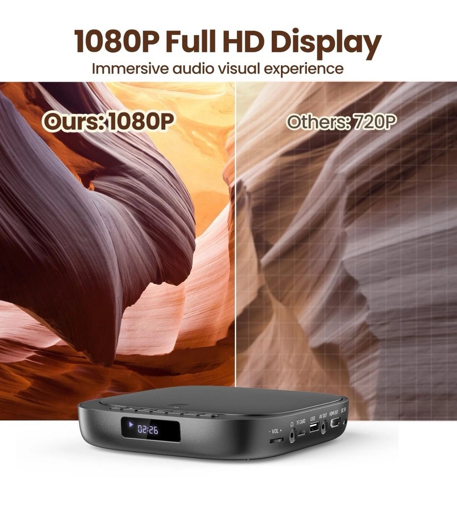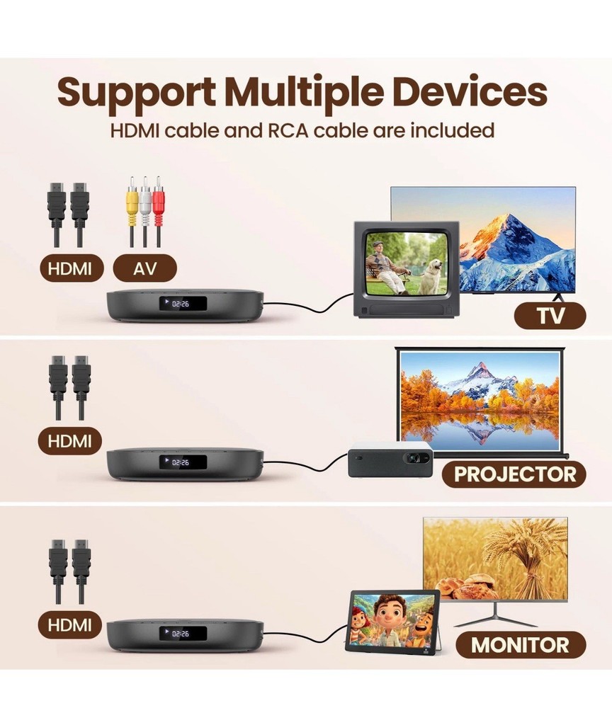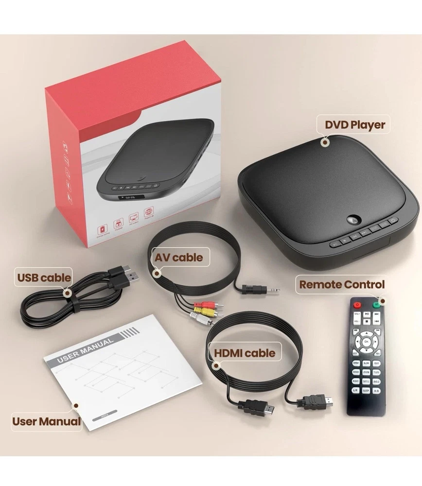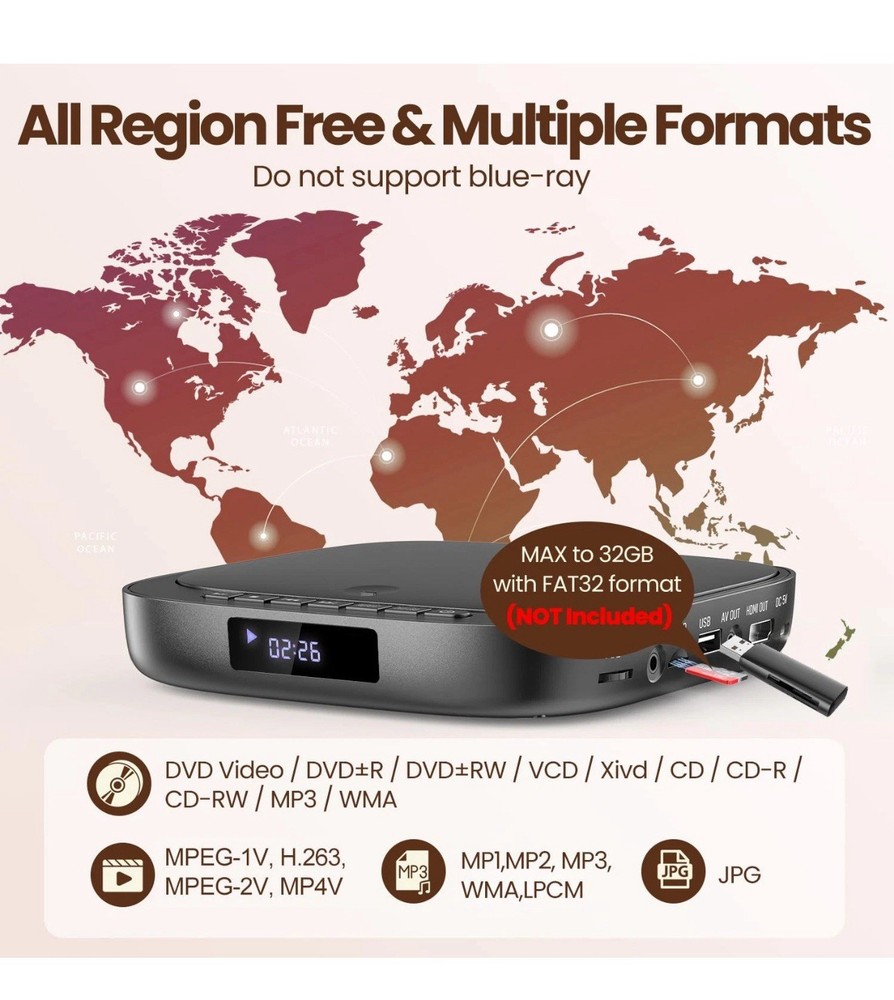 Mini DVD player with HDMI output HDMI & AV OUTPUT: DVD players for TV comes with HDMI and AV cables. The HDMI connection cable provides sharper video quality for Smart TV, projector and monitor, and the AV cable supports connection to old TVs. ALL REGIONS FREE: Region free DVD player supports many disc formats, including (DVD/SVCD/CD/CD/MP3/Kodak Picture/Photo CD/DivX). Note: Blu-ray discs are not supported! USB /TF CARD INPUT: mini DVD player supports playback of MPEG-1V, MPEG-2V, H.263, XVID, DX50, DIVX, MP3, MP2, WMA, AC3, PCM, JPG (max. 32GB with FAT32 format, resolution up to 720p). DRIVE UPDATE & BREAK POINT MEMORY: Ours DVD players features an updated drive core that enables quiet loading and fast reading of DVDs, as well as an error correction function that makes it easier to read discs with scratches. The breakpoint save function ensures that you always pick up where you left off. Note: Blu-ray discs are not supported! Cannot be connected to a computer as an optical drive!