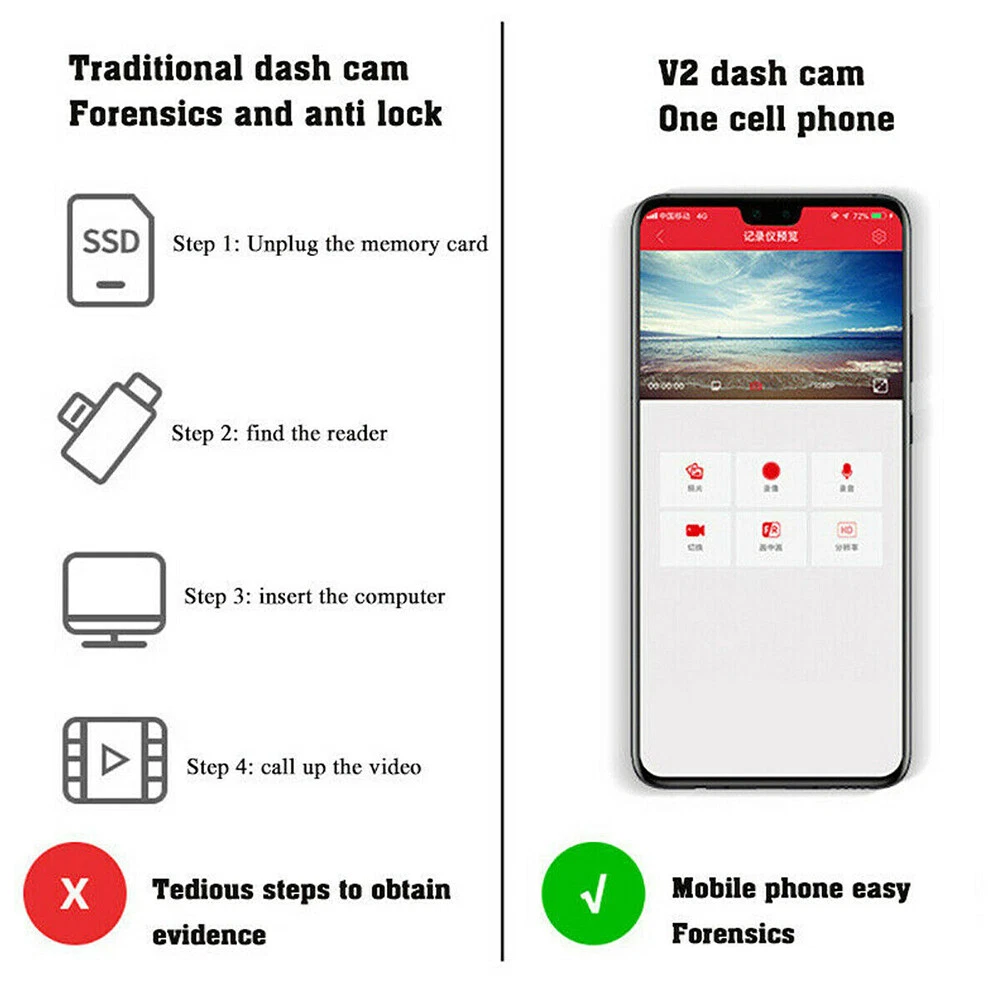 Specification: Name: Car DVR Camera Model: V2 Material: plastic Color: black Power Cable: 3.5m Rated voltage: 12V-36V Pixel: 1200W Resolution: 1080P Video coding: H.265 Recording angle: 170 ° rotatable Storage: TF card (maximum 32G) Appearance size: 75 x 70 x 30(MM) / 2.95 x 2.76 x 1.18 in Memory card: TF card (not included) Data storage capacity: maximum support 64G Data storage time: cyclic record Transmission interface: USB Transmission rate: 30 frames per second Installation position: windshield (back glue) Voltage: 9-36V Lens: single camera, front camera Parking monitoring: not supported WiFi interconnection: support APP:ROADCAM Features: 1080P Full HD resolution, provides you an outstanding picture quality, and 170° wide angle effectively reducing blind spots. WiFi function, connect to your mobile phone and free your hands for real-time preview, video playback, one click to share and video download. Loop recording, will start to work after the vehicle starts, automatically overwrite the previous files. Smart voice control, helps you easily wake up the voice assistant for safer driving. Built-in three-axis three-dimensional collision acceleration sensor, when the emergency brake is detected, the recorder automatically opens the video and locks the scene. Installation method: USB socket is connected to USB interface, without cigarette lighter or car power cord 1. The use of the product requires the mobile phone to download the APP. After entering the APP, the pop-up page needs to be checked to allow it; 2. Confirm whether the local network is turned on: 3. During the operation, the Wifi cannot be connected. The Wifi of the product starts with: BD_DVR. After the normal driving recorder is used, open the WiFi of the mobile phone to search for the WiFi of the recorder, select to enter the connection, enter the password (the manual is written), and then use; 4.Android and Apple can be used, APP can only use : ROADCAM Package Includes: 1 * DASH CAM 1 * USB cable 1 * User Manual On Mar 6, 2025 at 03:06:46 PST, seller added the following information: