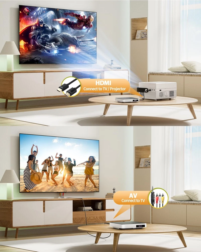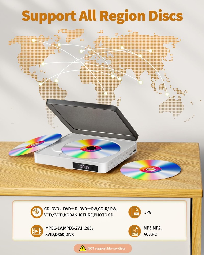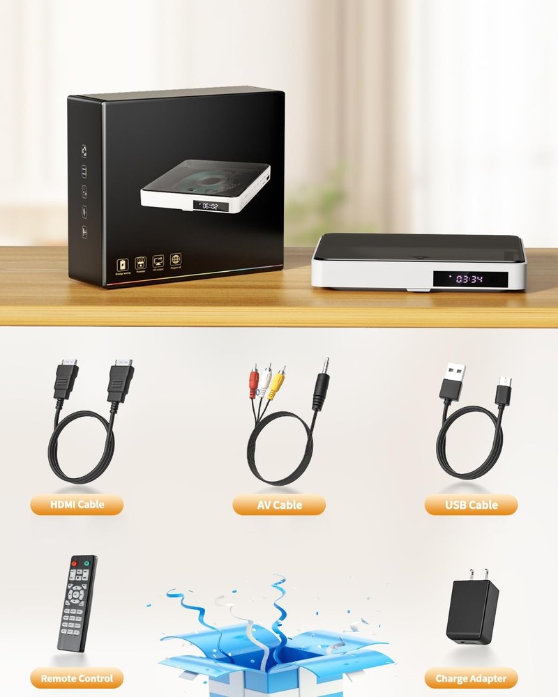 Players for TV: It has connection methods for TV- HDMI and AV. CD player: small player has the earphone jack and support CD disk. You can bring it out as a CD player. All regions free player: This player hdmi support multiple regions disk, formats: CD, , -R/+R, -/+RW, CD-R/-RW, VCD, SVCD. USB Input: It has the USB port and support to use USB to play video. USB fomat FAT32 and up to 32GB. mini player with TF Input: If you have this card you can files in it and play on this player. This card is NOT included in the package. Memory Function: This player hdmi has the memory function, so it can star from the point you leave last time.
