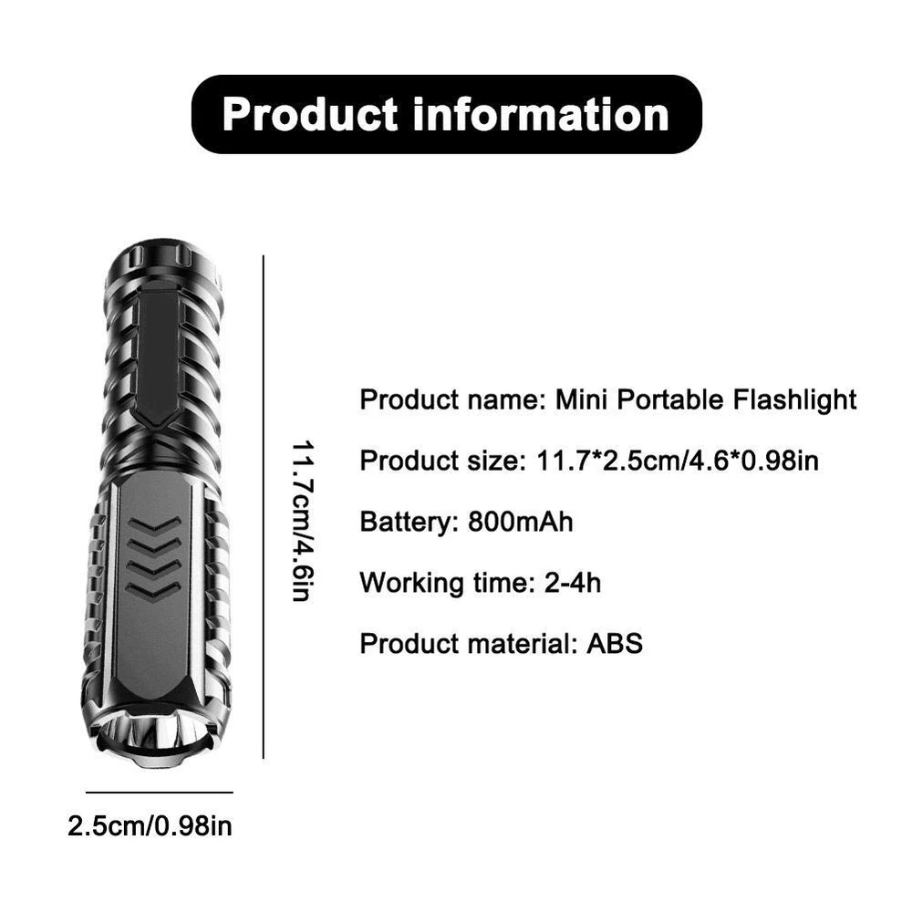 Description Description&Preview shipping&policy Description: Product name: Mini Portable Flashlight Product size: 11.7*2.5cm/4.6*0.98in Battery: 800mAh Working time: 2-4h Product material: ABS Product features: 1.High brightness: The LED tactical flashlight is ultra-bright, providing ample illumination for use both indoors and outdoors. 2.USB rechargeable: With its convenient USB charging feature, you can easily recharge the flashlight on-the-go, making it a great choice for outdoor activities or emergency situations. 3.Long-range beam: The flashlight offers a far-reaching beam, allowing you to see a great distance ahead of you even in the darkest of conditions. 4.Compact and portable: Its small size and construction make it easy to carry with you wherever you go. It is perfect for camping, hiking, fishing, and other outdoor activities. 5.Multi-functional: The flashlight comes with a range of features and modes, including strobe, and high/low beam modes, making it suitable for a range of tasks and environments. Precautions: 1. As we all know , the different computers display colors differently, the color of the actual item may vary slightly from the following images. 2. If you feel difficult to choose the size, you can feel free to contact me we will give you some suggestion, but it is for you reference only. Package includes: 1 pc Mini Portable Flashlight with Charging cable Preview: Thank you for your purchase Problems? You can follow below process to contact us. There is a time zone difference,but we will do our best to quickly response to your questions: Shipping ● We will arrange shipping for you within 24 Hours after payment cleared except the holidays. ● We always send the item to the address you give us on Payoneer to ensure the security of the item. If you have changed your address, or want us to ship to another address, please change to the new address when you pay us with Payoneer, otherwise we will not be responsible if the package is lost. Payments We accepts Payoneer only If you have any questions about the payment,please contact us through eBay message. Import Duties In case some duty is due Upon delivery, it is your responsibility to meet that expense and this may cause delays to delivery schedule and you may have to pickup goods at the customs office. Terms & Conditions By bidding on this item,the Buyer agrees to all of the terms and conditions as outlined in this listing .please ensure to read and agree to All eBay terms and Conditions before bidding. All pictures are for illustration purpose only and Colours may vary slightly. Our store obeys all eBay Rules and Policies. Returns Policy To Return an item you must contact us and take photos of your item to clearly show any damage or unusual aspects of it. Approved returns will be subject to inspection on arrival. Items must be returned in original condition with all original packaging. All shipping and handing charges are non-refundable Return delivery costs are the responsibility of the buyer. We will cover the cost if sending replacement/repaired items. Within 7 days after receiving your products, we offers a no-hassle 7 day exchange/replace only if your items are found to be defective by manufacturer.