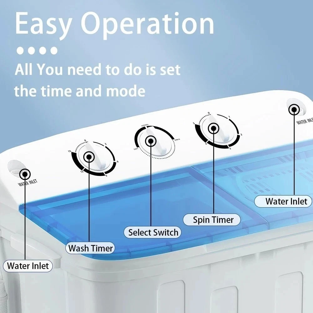 About this item Easy to Operate: Our portable mini compact twin tub washing machine saves you time and effort by eliminating the need to go to the laundromat or wash things by hand in the tub. Large Capacity: The washing tub has a rated capacity of 11 lbs and the spinner dryer has a capacity of 7 lbs. Perfect for small loads. Powerful Wash and Spin: With 240 W washing power and 110 W spinner power, our machine will help you save uch effort on washing. In addition to the mini washing machine, you'll also receive a drying rack and 10 hangers, making it easy to wash and dry clothes in one purchase. Compact Twin Tub Design: Convenient for home use with a filter net on the side of the washing barrel for quick filtering and easy cleaning. The cover plate needs to be put above the clothes inside when using the spin tub to avoid high speed shaking and spinning. Easy assembly is required with all accessories packed in the package. Time, Space, and Money Saver: The washing cycle is up to 15 minutes and the spinning cycle is up to 5 minutes each load, saving you valuable time. The overall dimension is 23.5 x 15 x26.6 inches, making it suitable for limited space. No installation is required. Compared to going to the laundromat and paying for laundry, you only need to pay for thirty trips to have our washing machine forever! Shipping We offer FREE shipping on all orders! We ship within Three business days of payment, usually sooner. We use a selection of shipping services such as UPS, FedEx, USPS etc. Local pickups and combined shipping options are not provided at this time. Return You can return a product for up to 30 days from the date you purchased it. Any product you return must be in the same condition you received it and in the original packaging. Please keep the receipt. Payment We accept payment by any of the following methods: PayPal Please pay as soon as possible after winning an auction, as that will allow us to post your item to you sooner! Feedback Customer satisfaction is very important to us. If you have any problem with your order, please contact us and we will do our best to make you satisfied. Contact Us If you have any queries, please contact us via ebay. We usually respond within 24 hours on weekdays. Please visit our eBay store to check out other items for sale! Thank you for shopping at our store. Product Description The washing cycle is up to 15 minutes, and the spinning cycle is up to 5 minutes per load, saving you valuable time as well. No installation is required, and all accessories are included, making it easy to assemble and use right away. The Erivess Portable Twin Tub Washing Machine is a great investment for anyone looking to save money on laundry while also enjoying the convenience of washing clothes at home. Clothes Drying rack is included Once have, all functions included(washing+spinning+Clothes Drying Racks) With the Erivess Portable Twin Tub Washing Machine, you can save a significant amount of money in the long run. No more costly trips to the laundromat or expensive dry cleaning bills. This mini compact washer is perfect for those on a budget who want to save money and time. With a 240W washing power and 110W spinner power, this washer is powerful enough to handle small loads with ease, while also being delicate enough for more fragile fabrics. The 11lbs washing capacity and 7lbs spinner capacity mean that you can wash and dry your clothes quickly and easily. Two Holes for Water Inlet It has 2 inlet holes on right & left side. You can freely install the hose based on your faucet location. Drain Hose Hung Up Drain hose can be hung up to the side after use. The washer can easily drain water but please note it is mainly supported by Gravity Drain. Transparent Cover Check laundry status at any time Top Lid for Safe Spin Drying Spinner can only make 80%-90% drying which means clothes still need sunshine. The compact design of this washing machine makes it perfect for those living in apartments, dorms, or RVs, where space is limited. And with the added gift of the drying rack, you can save even more money by air-drying your clothes instead of using a costly dryer.