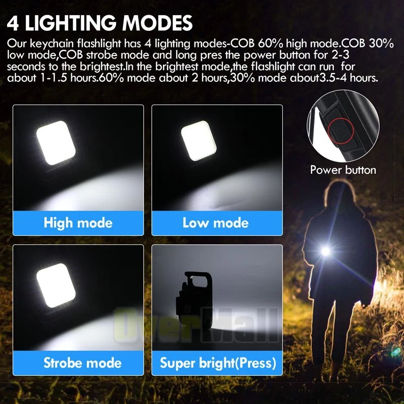 Mini Linterna Llavero Luz De Trabajo Magnetica Recargable Impermeable Camping Mini Linterna Llavero Luz De Trabajo Magnetica Recargable Impermeable Camping BEST CUSTOMER SERVICE ON OUR sale2015express EBAY STORE↓ ↓ ↓ SHIP From US Local Stock FAST & Free, 1-6 Days Arrival FREE Return, Seller Pay!! LIFETIME Money Back Guarantee LIFETIME Free Replacement Guarantee LIFETIME Warranty QUICKLY Reply within 24 Working Hours MOST orders ship within 1 business day with Tracking Number ANY PROBLEM please email us before feedback, thanks! Add our listing to Watchlist Or Add to Cart , you will get more discount!!! Feature: ✔ 3 Lighting Modes: The keychain light has 3 lighting modes, strong light, weak light and flashing mode, long press the power to turn on to super bright mode, you can adjust the lighting mode according to your usage needs. ✔ Super Bright COB Lamp Beads: The keychain light uses a powerful LED with 30 super bright COB lamp beads, which can provide up to 500 lumens of illumination, enough to illuminate your roads and small dark spaces. ✔ Portable Design: This keychain light has a small magnet on the back, which can be strongly attached to the metal, small in size, easy to carry, and has an adjustable stand and a tripod hole, which not only frees your hands when working, it can also be placed at different angles or hung in specific positions. ✔ USB Charging: The keychain light is powered by a built-in 500mAh battery, the lighting time can be up to 4 hours, and the included USB charging cable can be used with portable power devices such as computers, laptops, car chargers, wall chargers and power banks , a red light is displayed when charging, and a green light is displayed when fully charged. ✔ Widely Used: The portable keychain light has a hook and loop, which can be easily fixed on the key ring or bag, with IPx4 waterproof function and impact resistance, it can also be used as a bottle opener, it can also be used as maintenance light, work light and outdoor camping emergency light. Specification: Product name: Multifunctional keychain light Colour: Black Light color: white Material: aluminum alloy + PC plastic Voltage: 3.7-4.2V Lamp beads: COB Irradiation distance: 0-50m Waterproof: IPx4 Power: 5W Brightness: 500lm Battery life: 1-3 hours Light source: 6W 30 COB lamp beads Lighting time: 4 hours (highlight 1.5 hours) Lighting mode: 60% strong light - 30% weak light - flashing (long press to turn on super bright mode) Function: bottle opener, emergency light, work light, inspection light, magnetic suction Battery: Built-in 500mAh polymer battery Charging port: USB Type-C Product size: 61*45*27mm/2.4*1.77*1.06inch Package size: 95*55*28mm/3.74*2.17*1.10inch Package include: 1x Multifunctional Keychain Light 1x USB Charging Cable 1x Manual Payment Shipping About Feedback About us Contact us Payment 1. Paypal Accept. 2. Payment should be sent within 4 (FOUR) days auction closing. Or unpaid dispute will be filed for closing auction. Shipping 1. Fast shipping from NJ, US. 2. Shipping available time: Mon. - Fri. exclude holidays 3. The orders will be handled in 24 hours after payment got. Ship to Paypal Address ONLY. About Feedback If you are dissatisfied for any reason, please do not be quick to leave negative/neutral feedback. We work hard to make sure EVERY CUSTOMER 100% SATISFIED and resolve any problem for you and always leave positive feedback to all our customers. About us 1. Welcome to OverMall, We pride ourselves on providing the outstanding service and high qualtiy products, make our customer feel confident buying online. 2. For the most US address, we offer free standard shipping . 3. By shopping with us, you can guarantee the latest technology for the best possible price. Contact us You are welcomed to contact me for any question. I will reply your email in about 24HRS in business days.
