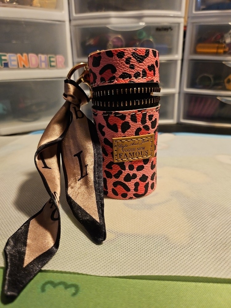 This mini keychain lipstick barrel bag purse charm coin purse scarf accessory is a stylish and practical addition to any woman's accessories. Made of faux leather with an animal print pattern, this purse features a colorful design and accents like a scarf, keychain, and bow. The multifunctional item serves as a lipstick case, coin purse, and keychain all in one, making it a convenient option for on-the-go use. Perfect for adding a pop of color and flair to any outfit, this keychain accessory is sure to stand out with its unique design and theme inspired by coins.