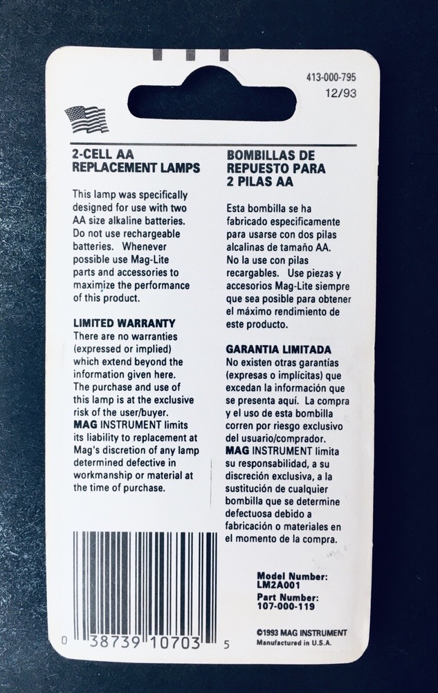 One New 2 Cell AA Mini Maglite Replacement Bulbs. 2 Bulb Blister Pack. Incandescent in Original Factory packaging. Old stock and packaging. Some packages may have some cosmetic defects. Combined Shipping Discounts available. This item ships free with any other purchases with standard shipping with tracking. Shipping discounts are remitted as a refund.