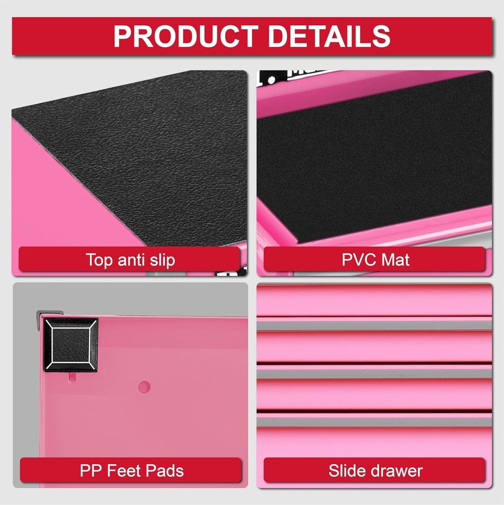 P.I.T. Mini Pink Tool Box, Portable 5-Drawer Micro Roll Cab Steel Stackable Tool Box with Liner, Pink Small Tool Case for Tools Storage and Organizers, Home DIY Multiple Storage Mini Tool Box - 8.6 X 4.6 X 7.9 Inches, lightweight and portable design, suitable for your day use. You can also match the top chest to use together or separately. Please check the size before you place an order. It's a small box, if you mind, please don't buy it Wide Application - Strong function for home, office, warehouse, jobsites and so on. The micro tool box is suitable for storing small tools and accessories storing various parts like business cards, pens, pencils, paper clips, and much more Anti-Slip Pads Design - There are 4 anti-slip pads on the bottom of the box to be stable Smooth Glide 5 Drawers - 5 drawers are equipped and provide a smooth glide operation Equip with Liner - Provides protective moisture barrier between tools and drawer, and protect your tools from rust High Quality Material - This tool box is made of high quality Q235 steel for long-lasting durability. The surface is covered with powder pink paint finish, which is beautiful and easy to clean