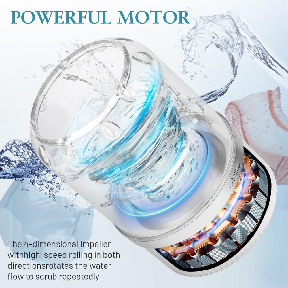 Underwear Washer, Portable Rechargeable Mini Washing Machine for Underwear 【Ultra-Light Travel Washing Machine】 Weighing only 1.3 lbs (lighter than competitors!), this mini portable washing machine features food-grade PP material for hygienic cleaning. Perfect as an underwear washing machine for delicates or travel washing machine for RVs/campers. Stores vertically in tight luggage spaces. Note: Spin-dry function not included. 【Gentle Hand-Wash Simulation】 Patented 360° dual-roller scrubbers mimic hand-washing motions (40% gentler than traditional machines). Designed specifically as a baby clothes & socks mini washer, with enhanced stain removal for bras, underwear, and sensitive fabrics. 【Space-Saving Portable Design】 Fits under beds, dorm closets, or carry-on luggage. 1.0L capacity occupies 65% less space than standard portable mini washing machines. Includes foldable handle for effortless transport. 【Long-Lasting Rechargeable System】 3000mAh battery delivers 50 mins effective runtime (Pro Tip: Pause 10 mins after 20 mins of use). Two smart cycles: Quick 5-min rinse or deep 10-min clean. USB-C fast charging included. 【24/7 Customer Support Guarantee】 Contact our US-based team anytime for issues with your mini washer. 100% satisfaction guarantee with replacement/refund within 30 days. Response in <12 hours!