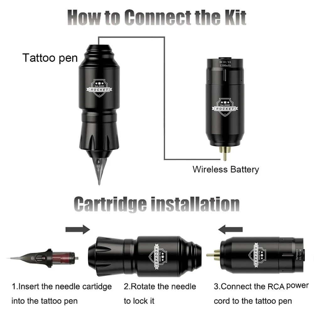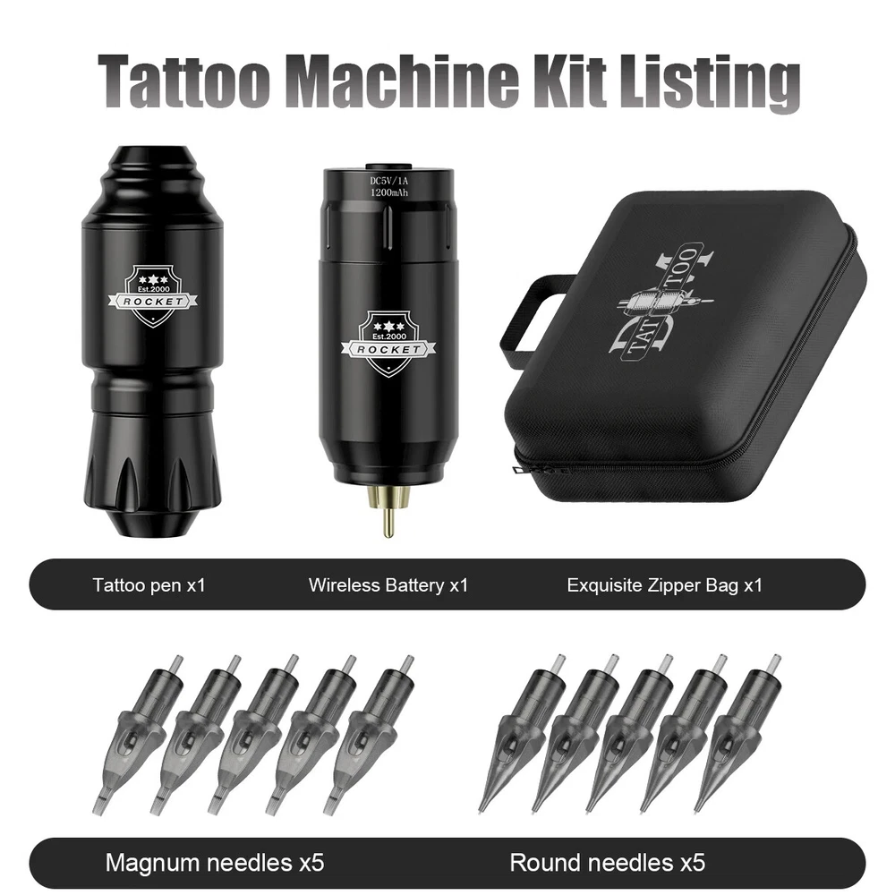Tattoo Pen Kit Accessories List: 1、Rocket mini tattoo pen 1pcs(for lining and shading) 2、Wireless mini tattoo power supply 1pcs 3、DM Tattoo Cartridge Needles Mixed 10pcs(1201RL 1203RL 1205RL 1207RL 1205RS 1207RS 1209RS 1205M1 1207M1 1209M1; 1pcs/size) 4、Tattoo machine pen connecting line 1pcs 5、Wireless tattoo battery charging line 1pcs 6、DM 5ml premium tattoo ink 7bottles 7、Tattoo repair cream 1pcs 8、Black disposable gloves 1pair 9、Medium tattoo ink caps with base 10pcs 10、Tattoo transfer paper 1pcs 11、Black self-adhesive bandage 1pcs 12、Tattoo machine pen sleeves 3pcs 13、Tattoo table clean pad 2pcs 14、Tattoo machine pen kit manual 1pcs