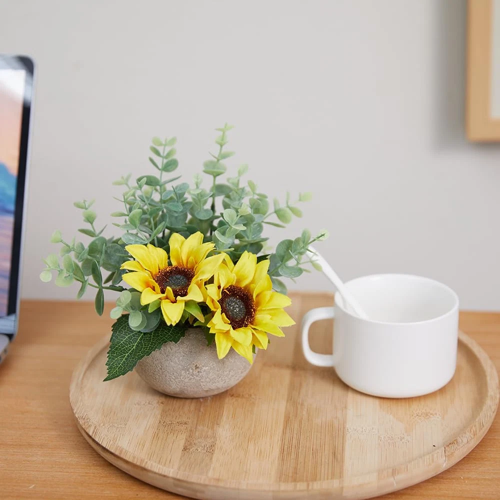 đ» ăWhat is inside the packageă When you receive the package, you will be pleasantly surprised to find 10 eucalyptus leaves, 2 fake sunflower heads, 1 sunflower leaf, and 1 cement pot inside. You will experience a feeling of happiness from sunflower bathroom decor. đ» ăExciting Appearanceă Our small artificial potted sunflower use eucalyptus leaves, which make them more vivid and vibrant, giving them a natural appearance. Sunflowers kitchen decoration are full and their leaves are clear, giving people a feeling of being bathed in sunlight. đ» ăSunny and cheerful moodă The representative of sunflowers for home is WARMTH/LOYALTY/SUNSHINE//POSITIVITY. When you see them, you will feel relaxed and full of vitality. đ» ăEasy to handleă: Our small sunflower in pot do not require watering or wilting, and are easy to manage. đ» ăAvailable Scenariosă Fake small flowers with vases - arranged with fake sunflowers and eucalyptus trees, are a versatile core decoration that is perfect for enhancing various settings in your home, bathroom, kitchen, living room, farmhouse, party, bedroom and outdoor space. Whether you place it on a sink, windowsill, bookshelf, or table, this exquisite artificial autumn flower decoration can add a touch of elegance and warmth to any environment.