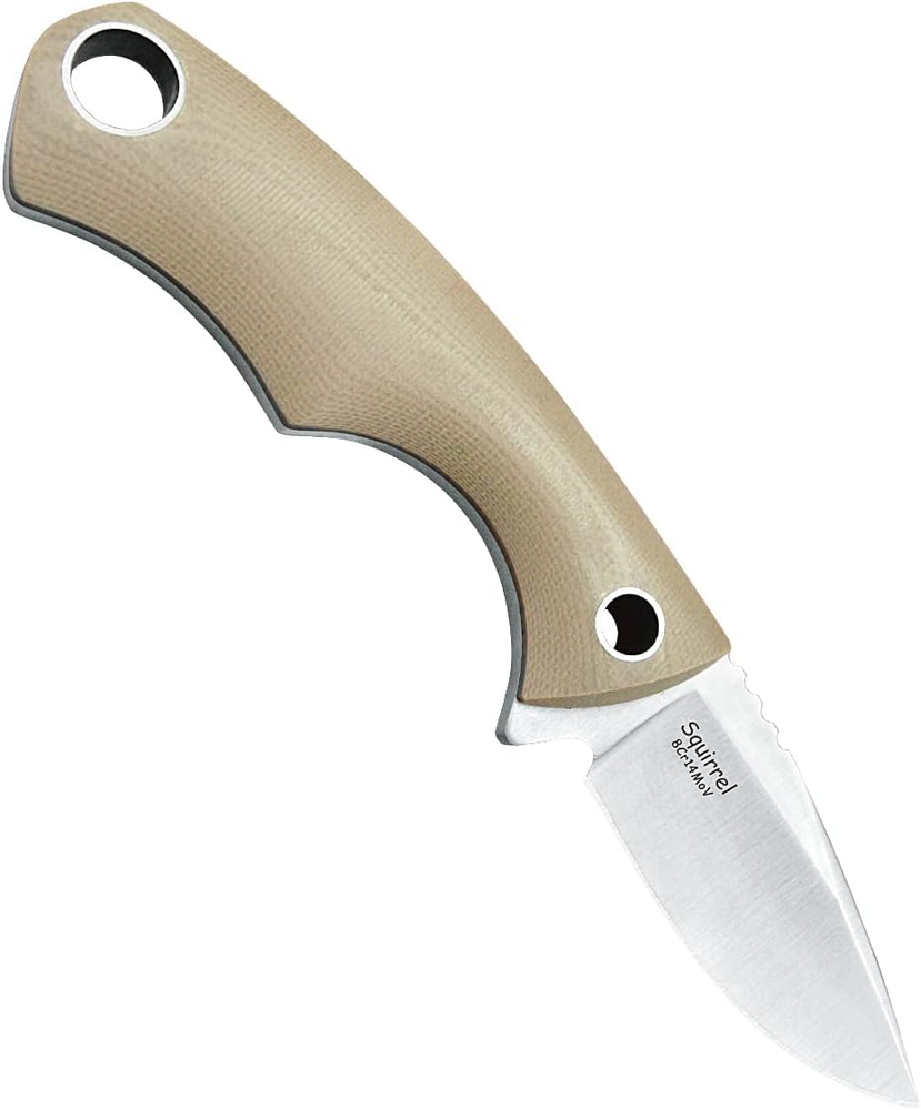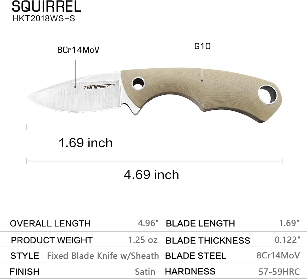 Blade Thickness: 0.126";Overall length: 4.68";Blade Length: 1.69";Weight: 1.23oz Small knife with kydex sheath can fit easily in pocket. Ball chain can make it as a neckace knife. Full tang fixed blade knife:The blade is made of 8Cr14MoV steel, can be qualified to various work tasks for outdoor use. Lightweight EDC knife: Compact utility and easy to carry. Little knife with G10 handle which is design for ergonomics grip, moistureproof, non-slip with reliable grip and wear resistance. Product Description Structure Introduction Blade Length: 43mm Overall Length: 119mm Weight: 51g Blade Steel: 8Cr14MoV Handle: G10 Style: Fixed Blade Knife with Sheath Sheath Material: Kydex TONIFE Squirrel Full Tang Neck Knife This is an outdoor knife that can be used as a camping knife, hiking knife, rescue knife, carving knife, fishing knife, and can also be used for daily use. The design of the sheath can better protect the blade and keep the blade sharp. This fixed blade knife also comes with a bead chain, which can be hung around the neck daily, which is very convenient to carry. The full tang structure not only makes the outdoor sports knife stronger, but also increases durability and balance, which is very suitable for camping and various outdoor activities. Knife blade Fixed full-tang knife: The blade is made of 8Cr14MoV steel, which is durable, not easy to break, not easy to rust, and can be used for various outdoor work. Handle G10 handle pocket knife: The handle is made of high temperature resistant and corrosion resistant G10 material, which is ergonomic, can be held for a long time without fatigue, and is highly comfortable when used. Knife sheath Fixed blade knife with sheath: The combination of sheath and bead chain not only protects the blade, but also allows the bead chain to be hung around the neck when necessary and used as a neck knife. It is the best partner for outdoor activities. Parameter Blade Steel 8Cr14MoV Blade Length 1.69" Overall Length 4.68" Handle G10 Weight 1.23oz Color Black /Orange /Warm Sand /Green