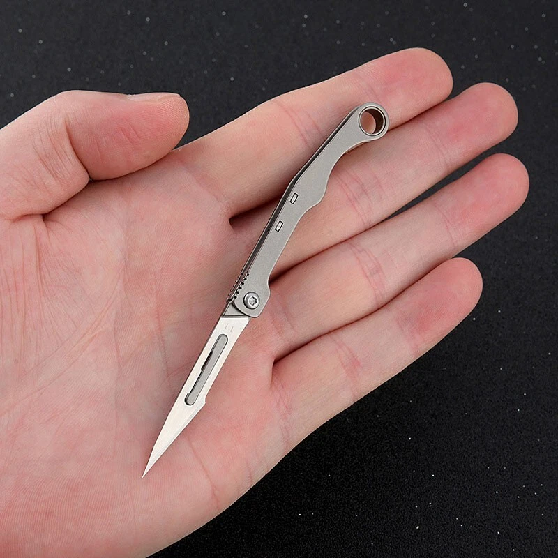 Description Mini Titanium Utility Folding Knife #11 Scalpel Blade Pocket Keychain EDC Outdoor Details: Made of TC4 titanium alloy and carbon steel. come with 10x #11 blades. It is a mini multi EDC tool, easy to carry. Handle Material: TC4 Titanium Alloy Blade Material: #11 Carbon Steel Color: Gray Open Length: 104mm Close Length: 60mm Handle Width: 8.3mm Handel Thickness: 5mm Blade Length: 20mm Blade Width: 7mm Blade Thickness: 0.2mm Blade Hardness: 58-60HRC Net Weight: 6g Package Included: 1pcs Mini Titanium handle with 10x blades. For Outdoor Hunting, Camping, Fishing, Hiking, Traveling, Cycling, Backpacking for Men & Women, for Everyday Carry, Best Gifts The cool pocket knife is a great gift for men and women, Birthday gift, Father's Day gift, Christmas gift, graduation gift, wedding gift, Thanksgiving gifts, Business gifts, office gifts, etc.