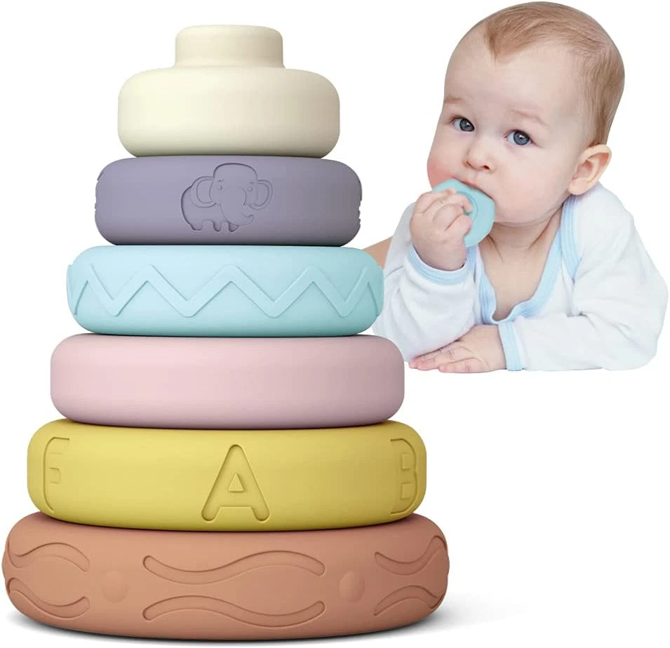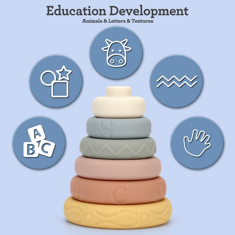 Unique Design - Our stacking toys building blocks comes with 6 vibrant color & fit size circles that catch babies eye and develop fine motor skills .There are animals,letters and special textures that is relief design on the surface of the baby ring toy. Fun Stacking Game - All babies are interested in stacking things. Cute stacking circle can build whatever shape that you want. Stack them up up up...All the way to the top. Then knocking down the stacker and remade. Fun never end! No Crying & No Tears - Are you worried about how to comfort crying baby? Our stacking ring is a quite good choice at this moment.The product will produce the BiBi sound when you squeeze it. Perfectly catch baby’s attention and make them stop crying. No crying, no tears, only smiles and laughter. STEM Early Development - Our ring stacker is a thoughtful baby sensory toys for babies. Include animals, shapes, letters and textures for baby early knowledge learning. It’s not only exercise children’s hand-on ability and creativity. Also develop kid’s color perception, digital cognition and shape recognition while they playing stacking game. Quality Guarantee - The stacking ring is made of high quality food grade silicone. It’s soft without any edge or corner. Smooth surface and chewable. It’s great for baby teething and biting in molar period. It is wonderful present for baby shower, Christmas and Birthday. Product Description The video showcases the product in use. The video guides you through product setup. The video compares multiple products. The video shows the product being unpacked. Frequently Bought Together Add to Cart Add to Cart Add to Cart Add to Cart Add to Cart Customer Reviews 4.5 out of 5 stars 2,349 4.5 out of 5 stars 2,349 4.7 out of 5 stars 13,209 4.5 out of 5 stars 36 4.0 out of 5 stars 4,379 4.0 out of 5 stars 4,379 4.3 out of 5 stars 85 Price $11.99 $ 11 . 99 $11.49 $ 11 . 49 $17.99 $ 17 . 99 — $34.99 $ 34 . 99 $34.99 $ 34 . 99 — Age 6+ months 6+ months 6+ months 0+ months 0+ months 0+ months 12+ months Educational Objective STEM, Hand-Eye Coordination STEM, Hand-Eye Coordination STEM, Hand-Eye Coordination STEM, Hand-Eye Coordination STEM, develop Sleep Quality STEM, develop Sleep Quality STEM, Fine Motor Skill Material Food-grade Silicone Food-grade Silicone Food-grade Silicone Food-grade Silicone ABS plastic ABS plastic Fabric Baby Essential ✔ ✔ ✔ ✔ ✔ ✔ ✔ Safety Test ✔ ✔ ✔ ✔ ✔ ✔ ✔