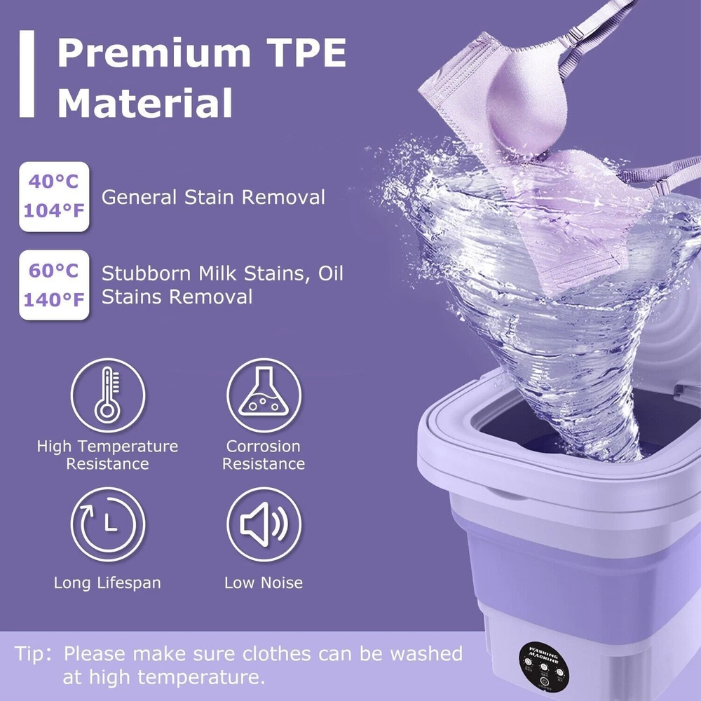 Featrure: Description • Compact and Portable :This mini washing machine is small enough to fit in your suitcase, making it perfect for students living in dormitories or those who frequently travel. • Energy Efficient :The folding design of this washing machine allows for efficient use of space and energy, making it an eco-friendly choice for those who want to reduce their carbon footprint. • Versatile :This machine can be used for washing a variety of items, including underwear, socks, and other small clothing items, making it a versatile addition to any household. • Easy to Use :With its simple design and easy-to-use controls, this washing machine is perfect for anyone who wants to quickly and easily clean their clothes without any hassle. Package: 1x washing machine 1x power plug 1x drain basket 1x drain pipe 1x English user manual Functional Upgrade Can Better Serve Us Deep cleaning One click dehydration Folding storage Fresh and odorless Easy to operate Simply press, convenient, and versatile to serve you Humanoid hand scrubbing Positive and negative bidirectional kneading Paired with high-frequency washing to effectively remove stains Product Properties Product weight: 3.53b Internal depth: 6.7in Working mode: wave wheel type Washing capacity: 6.5 liters Product material: TPE+PP material Rated voltage: DC 110-260V Rated power: 36W Fold Down Lightweight, easy to move, and easy to store in small spaces It is very suitable for camping, vacation, business travel, apartments, dormitories, and won't take up too much space Easy Folding Storage does not occupy space On a business trip, I easily put away my luggage and clean it all the way, accompanying me Low Level Drainage Outlet No residue of sewage After washing or dehydration, all sewage will be discharged along with the drainage outlet