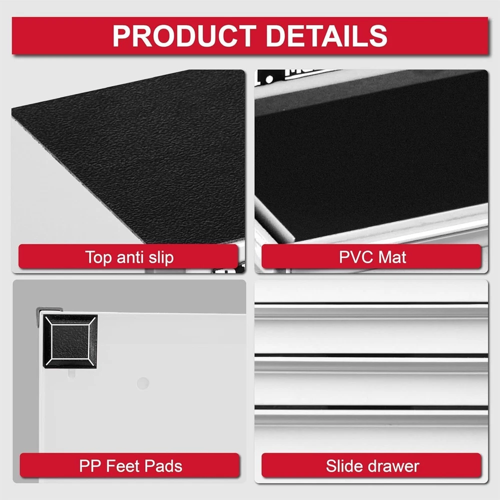Multiple Storage Mini Tool Box - 8.6 X 4.6 X 7.9 Inches, lightweight and portable design, suitable for your day use. You can also match the top chest to use together or separately. Please check the size before you place an order. It's a small box, if you mind, please don't buy it Wide Application - Strong function for home, office, warehouse, jobsites and so on. The micro tool box is suitable for storing small tools and accessories storing various parts like business cards, pens, pencils, paper clips, and much more Anti-Slip Pads Design - There are 4 anti-slip pads on the bottom of the box to be stable Ball Bearing Slide 5 Drawers - 5 drawers are equipped with smooth ball bearing slides which provide a smooth glide operation Equip with Liner - Provides protective moisture barrier between tools and drawer, and protect your tools from rust High Quality Material - This tool box is made of high quality Q235 steel for long-lasting durability. The surface is covered with powder white paint finish, which is beautiful and easy to clean On Feb 19, 2025 at 00:11:32 PST, seller added the following information: