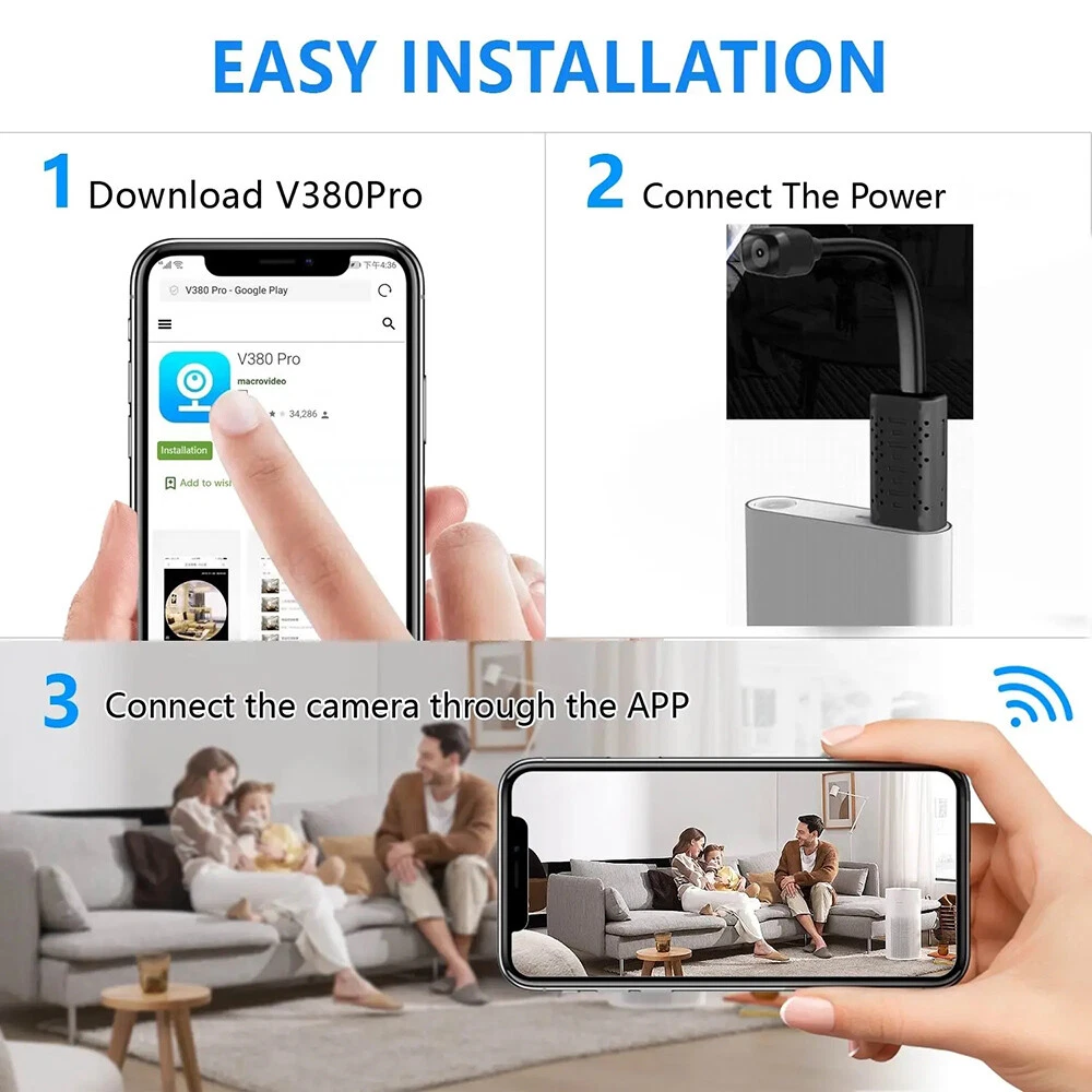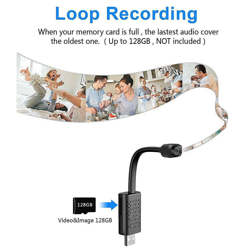 It is not allowed to use surveillance cameras to monitor and record others' privacy without their knowledge. Features: Remote playback/photo/recording. Excellent live nanny cam with app. App is compatible with iPhone or Android phones. Surveillance camera for office, home and car. HD live video, motion activated push alerts, IR night vision function, recording while charging. SD card recording, free apps, multiple cameras in one app, multiple users in one camera and more. Specification: HD 1080P USB mini wireless camera 1.4mm lens, maximum 140 degree wide angle Support night vision Support artificial intelligence body detection Support recording (can't support two-way audio) Support 2.4Ghz wireless internet (not support 5G) Support cloud storage (payment required) Application: V380Pro Memory Expansion: Maximum 128G ( 32GB complimentary ) Operating power supply: DC 5C/1A Power supply: USB Product size: 12*2.5*1cm Product weight: 23g Product material: ABS Product color: black Package Includes: 1 * Camera ( with night vision ) 1 * User manual 1 * 32GB card ( free ) On Dec 27, 2024 at 22:23:25 PST, seller added the following information: