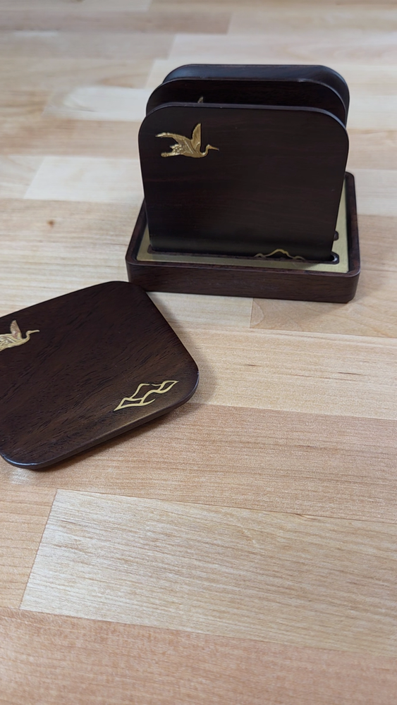 This mini wooden coaster set with holder is designed specifically for shot glasses, espresso cups, sake cups, and small drinks , making it perfect for bars, coffee stations, and compact tabletop spaces. Crafted from solid natural wood with a rich dark finish and elegant gold inlay accents, these coasters protect surfaces while adding a refined rustic touch to your décor. The compact size makes them ideal where standard coasters are too large. ✅ WHAT’S INCLUDED: 4 mini square wooden coasters 1 matching wooden holder ✅ FEATURES: Compact size for shot glasses & espresso cups Solid natural wood construction Decorative gold inlay design Smooth polished finish Space-saving holder keeps coasters organized Ideal for bar carts, coffee bars & small tables ✅ PERFECT FOR: Shot glasses & tasting flights Espresso & demitasse cups Sake cups Bar carts & home bars Unique gift ideas 📌 Care Instructions: Wipe clean with dry or slightly damp cloth. Do not soak. 📏 OFFICIAL DIMENSIONS Individual Coasters: Size: 7.5 cm x 7.5 cm x 0.8 cm (approx. 2.95" x 2.95" x 0.31") Holder (Estimated): Approx: 8.5 cm x 8.5 cm x 3.5 cm order ships the next day after purchasing