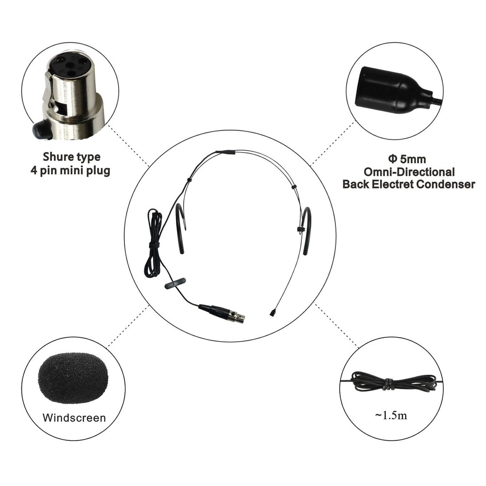 Product Feature: Professional Power: Industry-standard sound quality along with surprising durability make this mini headset microphone ideal for just about any vocal sound and speech application. Enjoy the freedom of movement, discreet operation, and exceptional performance fit for any occasion. The mini ear-hanging headset microphone answers the demand for affordable, innovative, and reliable headset microphones Lightweight, Comfortable & Durable: Ergonomic, flexible, and thin. This headset is ideal for applications requiring maximum performance and mobility. Wide bandwidth cardioid electret condenser mic ensures clean transparent audio and enhanced vocal pickup with improved gain. The beige flesh-toned color blends in with various skin types. Uses a standard mini XLR 4pin TA4F plug connector. A durable thin-metal frame can be easily adjusted to fit any user. The headset is also designed to fit comfortably for users wearing glasses, hats, or headphones Specification: Type Condenser Headset Microphone Connector 4 pin mini XLR (TA4F) Element Electret Condenser Polar pattem Cardioid Frequency Range 50 Hz - 17,000 Hz Max SPL 130 5dB SPL Impedance 1,500 Ohms +/- 30% (at 1 Khz) Max Input SPL 28dB Operating Voltage 1.0V - 10V DC Color Black Compatible For Shure Body Pack Transmitter Models L1, 11, LX1, SC1, U1, UC1, UT1, T1, ULX1, UR1, PGX... For ALL XLR 4PIN TA4F.