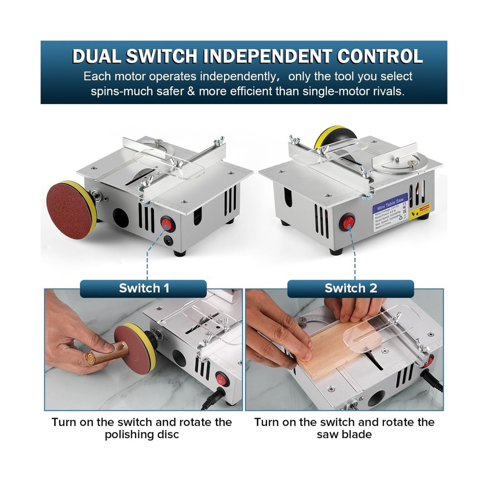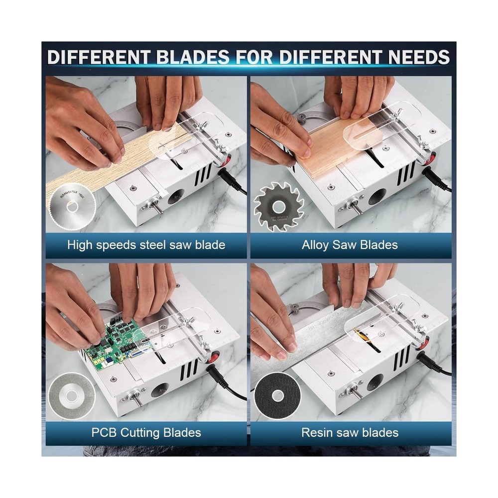 Mini table Saw,mini Table Saws for Crafts, Mini Multi Functional Table Saw, Dual-motor control for cutting, grinding,engraving and drilling.Speed & Angle Adjustable,for Wood/PCB/Acrylic/Plastic Description Features: Dual switch independent controlOur upgraded mini table saw bids farewell to the limitations of traditional single motor! Equipped with two independent pure copper motors and a dedicated independent switch control. The cutting function and grinding/polishing function will not start simultaneously, and each motor can run independently, which not only doubles the power, but also improves safety Adjustable Height FunctionThe mini table saw has the function of adjustable height, with a lifting range of 0-16mm. The adjustable function of the saw blade facilitates precise adjustment of the cutting depth according to the thickness of the material, ensuring cutting effect and accuracy. Lowering the height of the saw blade can reduce exposed parts and avoid accidental contact. When cutting thin materials, lowering the height appropriately can reduce the risk of material bouncing. Adjustable Cutting AngleThe mini table saw According to the desired shape, the cutting plate of the table saw can rotate from 0 degrees to 90 degrees. The front panel of the portable table saw is engraved with clear markings, which can accurately control the cutting angle. With the support of the table saw and the angle dial, the same angle can be quickly set. When making furniture, wood needs to be cut into various angles to achieve seamless connection between different components, such as making a 45 degree photo frame or a 90 degree table and chair frame. Four different saw bladesMini table saw set includes 4 different types of saw blades:PCB cutting blades, high-speeds steel saw blades, alloy saw blades, and resin saw blades. Mini table saw can cut include: PCB boards, wood sticks, plastic sheets, thin wood boards, copper-clad boards, aluminum tubes, copper tubes, etc. Mini Multifunctional Table Saw: The mini multi-functional table saw is a multi-functional table top tool Can be cut, polished, engraved.our equipped with drill chuck and sanding disc, it can hold drilling heads with a shank diameter of 0.5-3.2mm.The craftsman saw can also be fitted with a flexible shaft to drill or engrave items. The saw table set comes with over 100 small parts for your use,Make our small handicrafts an essential tool for every craftsman. Product Details: Brand: Nicklaua Color: Silver Blade Material: Alloy Steel Surface Recommendation: Aluminum Power Source: Corded Electric Brand: Nicklaua Color: Silver Blade Material: Alloy Steel Surface Recommendation: Aluminum Power Source: Corded Electric Special Feature: Brushless Included Components: Mini Table Saw Product Dimensions: 8"L x 4"W x 3"H Item Weight: 2.88 Kilograms Number of Teeth: 50 Cutting Angle: 90 Degrees Blade Shape: Rectangular Handle Material: Aluminum Manufacturer: Nicklaua Item Weight: 6.34 pounds Item model number: TJ-02 Style: Set2 Material: Aluminum Item Package Quantity: 21 Special Features: Brushless Batteries Included?: No Batteries Required?: No Date First Available: June 17, 2025 Delivery We Do Not Ship Outside of the Continental US. Return Policy All items qualify for returns within 30 days of receipt. Seller is responsible for return shipping on any item that is not damaged. Feedback We take our reputation seriously, we buy and sell online, so we understand the value of trust. If you are unsatisfied with your order, please contact us and we will work with you to resolve it to your satisfaction.