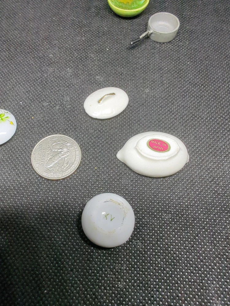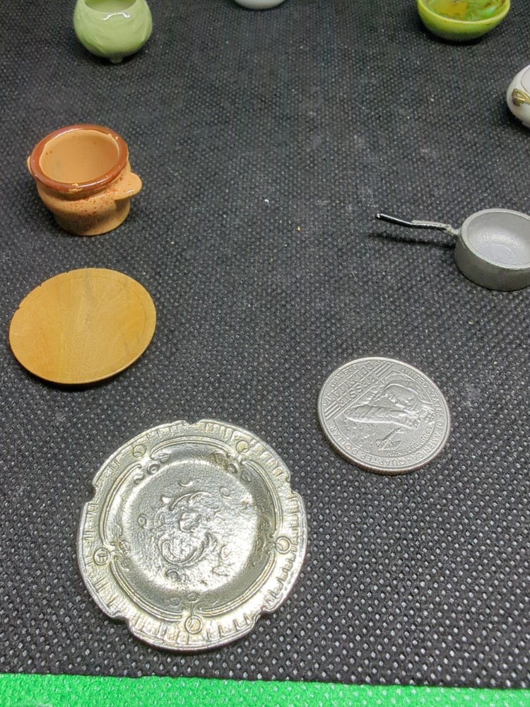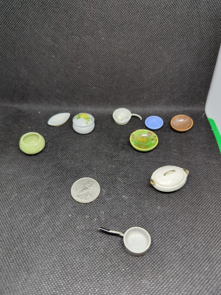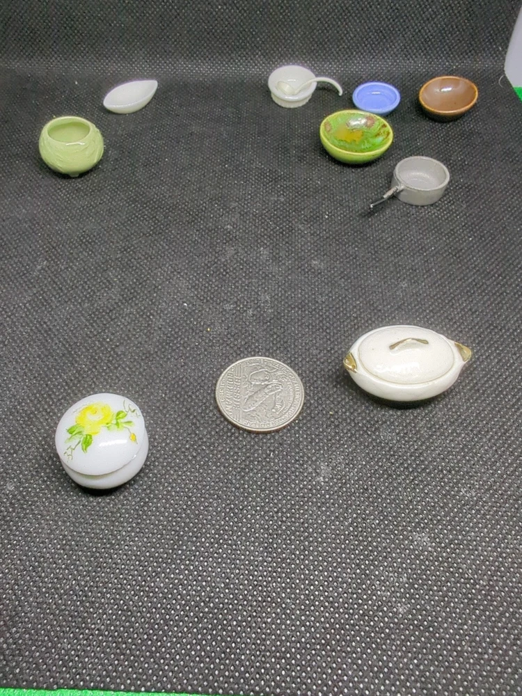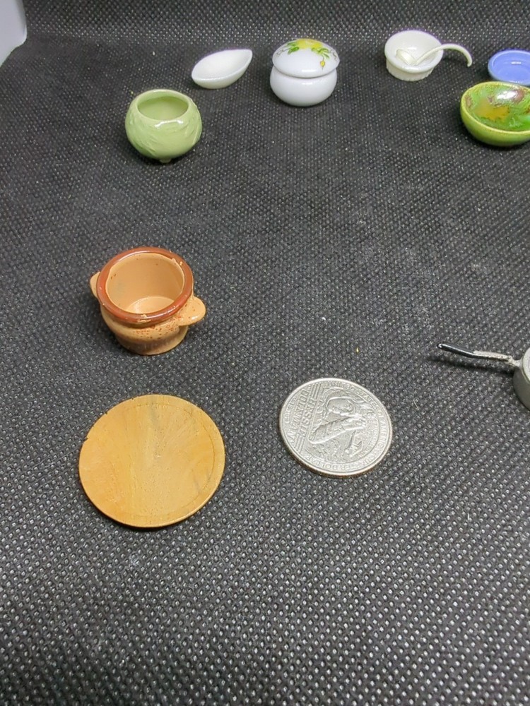 This lot includes 13 assorted kitchenware items perfect for decorating a miniature dollhouse kitchen. From tiny cooking utensils to decorative dishes, these accessories add a realistic touch to your dollhouse kitchen setting. Ideal for collectors or hobbyists looking to enhance their miniature world with charming details. 542