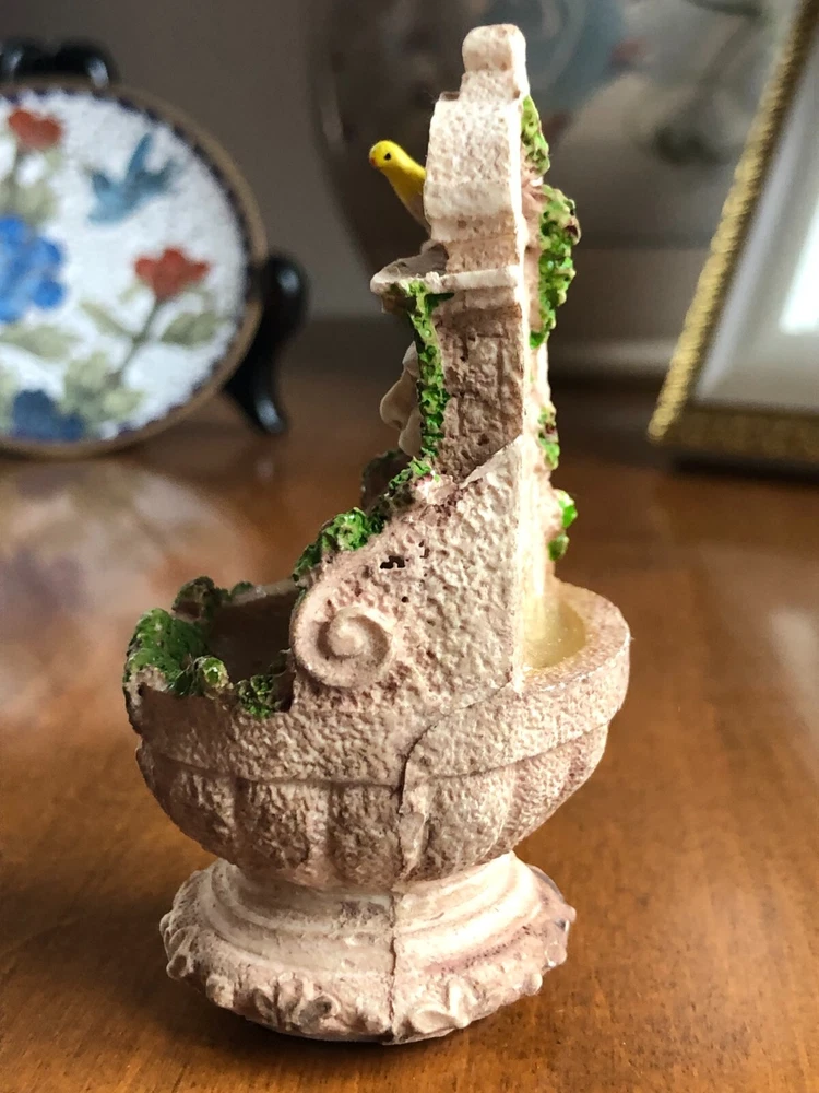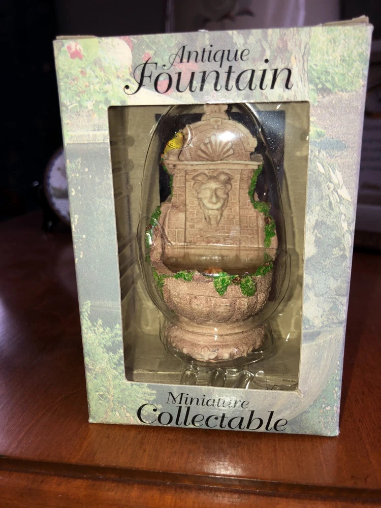 This miniature dollhouse fountain is a handcrafted and hand-painted replica of an antique bird bath, suitable for use in pretend play, fairy gardens, or dollhouses. It was manufactured in 1994 and features a Victorian style design in vibrant multicolor. The item, measuring 4 inches in height, 4 inches in length, and 2 inches in width, is made of resin and comes in its original packaging. Perfect for dollhouse enthusiasts, this 1:12 scale Dollhouse Garden Fountain by Shelby Limited adds a charming touch to miniature settings.