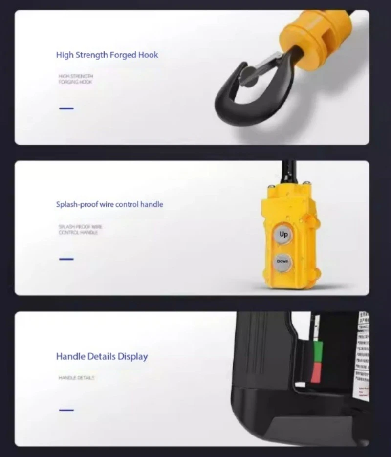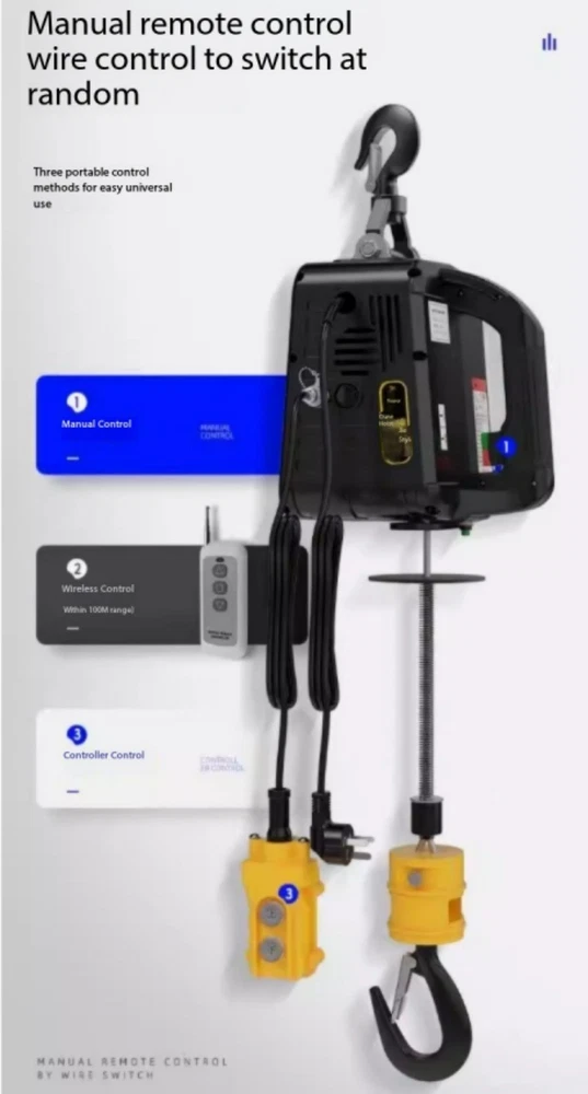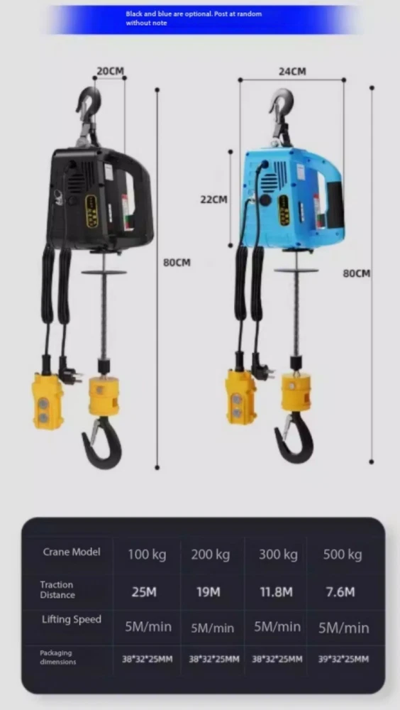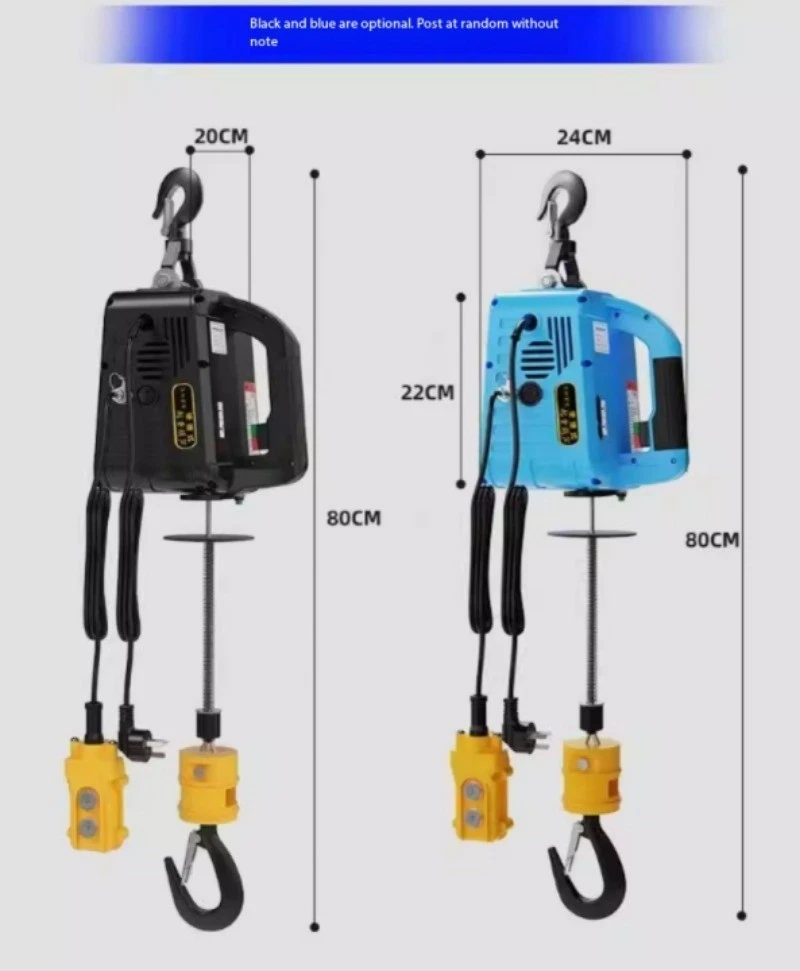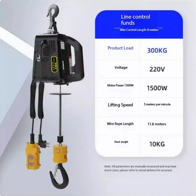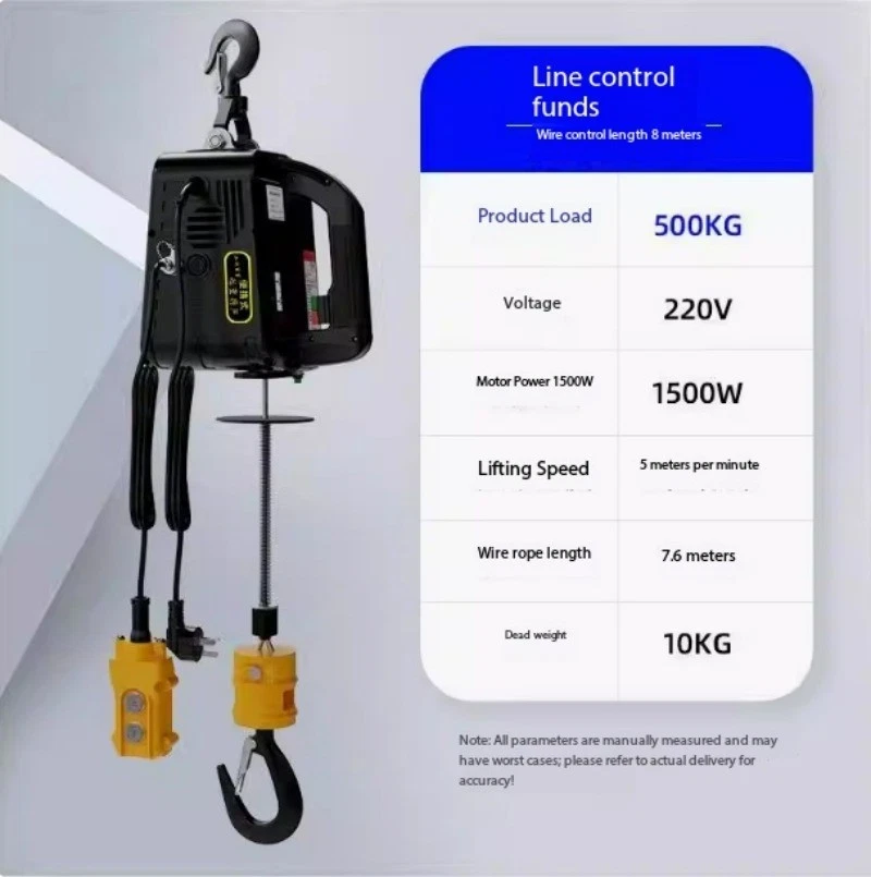 Mini Electric Hoist 220V Portable Home Use Small Crane Compact Lift Remote-Controlled Winch Product Load Capacity: 100KG Voltage: 220V Motor Power: 1500W Lifting Speed: 5 meters/minute Wire Rope Length: 25 meters Net Weight: 10KG Note: All parameters are manually measured and may be subject to slight variations. Actual product specifications prevail upon delivery! Product Load Capacity: 200KG Voltage: 220V Motor Power: 1500W Lifting Speed: 5m/min Wire Rope Length: 19m Net Weight: 10KG Note: All parameters are manually measured and may vary. Actual product specifications may differ upon delivery. Product load capacity: 300KG Voltage: 220V Motor power: 1500W Lifting speed: 5m/min Wire rope length: 11.8m Net weight: 10KG Note: All parameters are manually measured and may be subject to slight variations. Actual product specifications may differ upon delivery. Product load capacity: 500KG Voltage: 220V Motor power: 1500W Lifting speed: 5m/min Wire rope length: 7.6m Net weight: 10KG Note: All parameters are manually measured and may be subject to slight variations. Actual product specifications may differ upon delivery.
