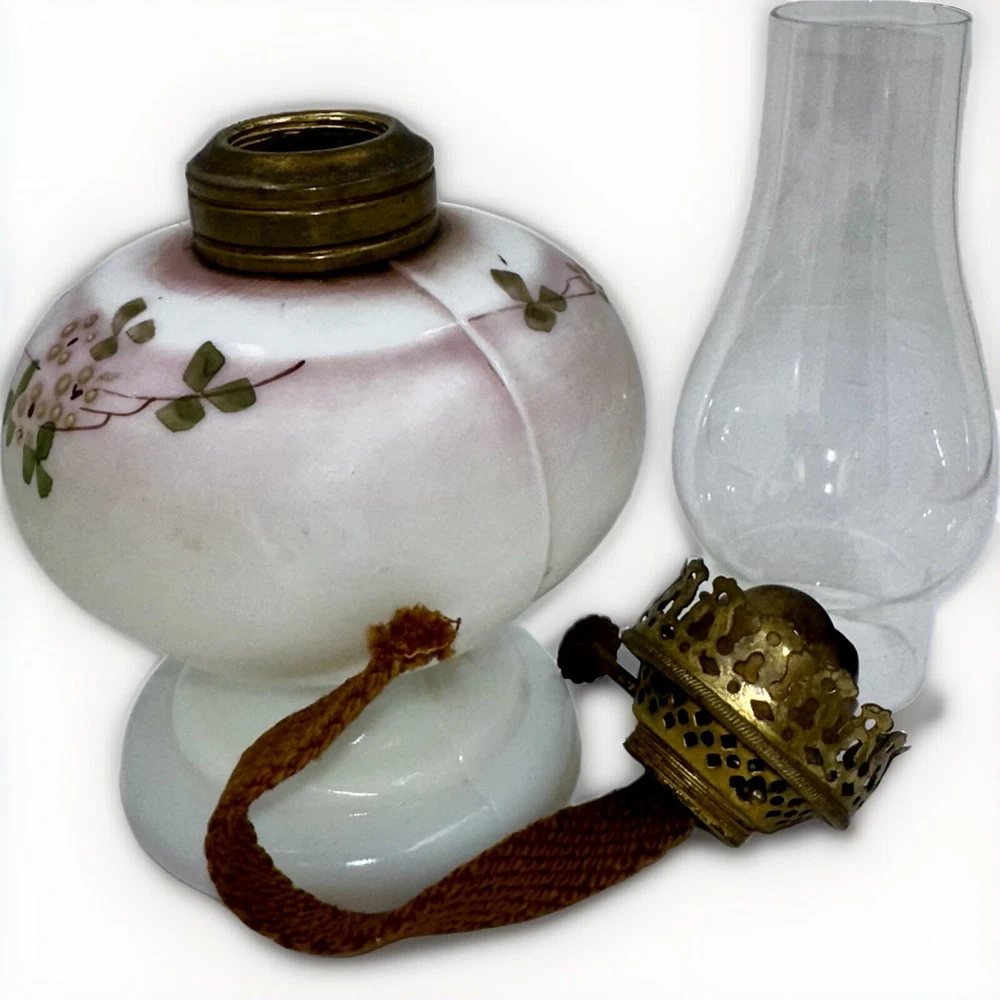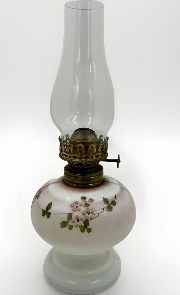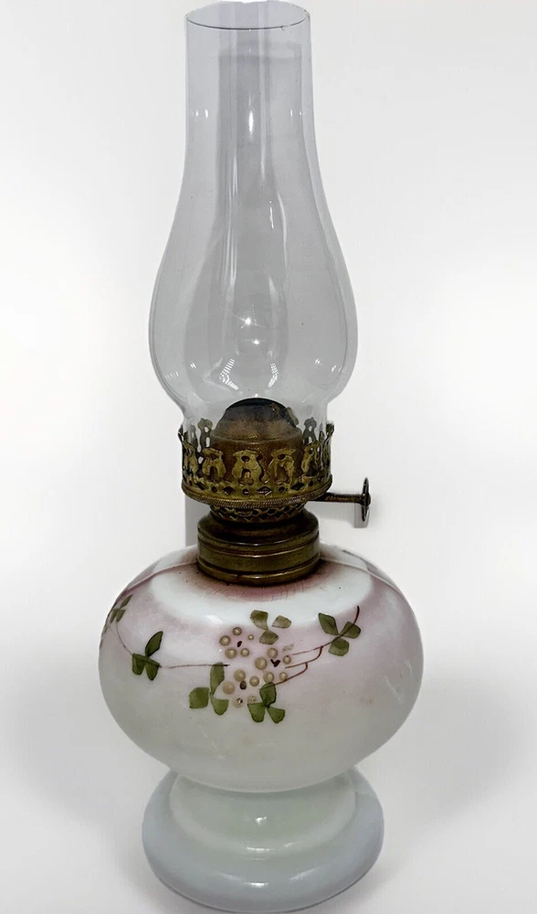 Antique miniature oil / kerosene table or bedside lamp Opal glass with a satin finish and enameled floral motif - very pretty! Clear glass chimney included Antique burner included with working wick Very nice antique condition with no chips or cracks - ready to use Approximate measurements ( may vary slightly ): 9 1/4" high to top of shade 4 3/8" high to top of brass collar 3" diameter base Please look closely at the pictures; they are part of the description. We are describing what we see but you are the expert. If described as VINTAGE or ANTIQUE, it should never be expected to look like new. Color or image quality displayed on your device may not be exactly as the item appears in person, but we do not alter our pictures. SHIPPING - Please Read: Our items are typically shipped UPS with prices fixed by the carrier. We have added the USPS option in the case of shipping to a P.O. Box. The selling platform retains a percentage of our shipping fees so not all of what you pay actually comes to us. Shipping charges outside the U.S. are not set by us since we use ONLY the eBay International Shipping Program for that. We are not able to invoice you or offer shipping discounts for international sales. Please consider that you are easily able to browse our listings to purchase items that cost us time (hours at auctions and "clean-up" time) and money (travel, shipping supplies, etc.) to present to you. Please contact us with any serious concerns before posting low feedback or star ratings. We will do our best to respond promptly. 1 4E 25 Track Page Views With Auctiva's Counter