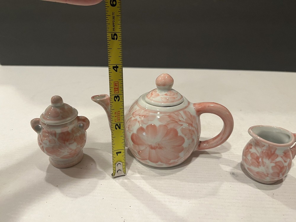 The product is a set of three small miniature porcelain items - a teapot, pitcher, and sugar bowl, all adorned with a red floral pattern. The style is Victorian, and they are part of a trinket box collection. The material is porcelain with a painted finish. These decorative collectibles are perfect for all occasions and would make a charming addition to any collection or display.