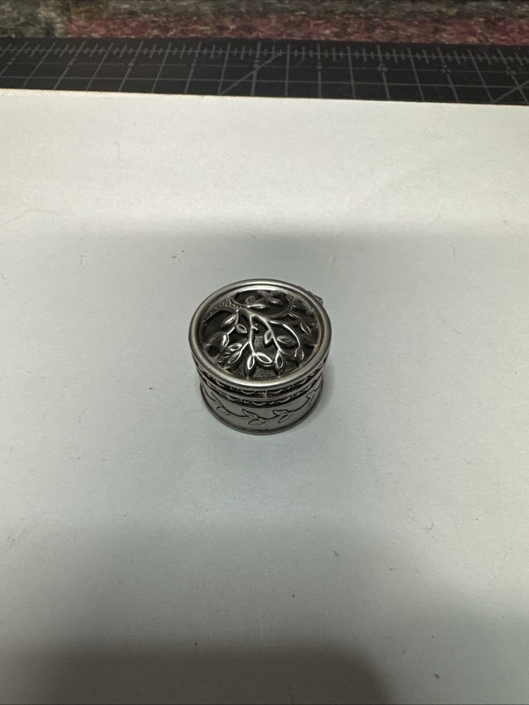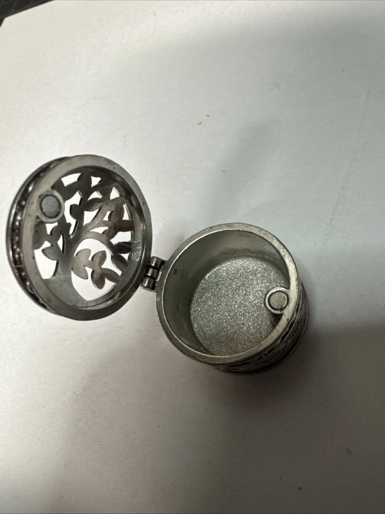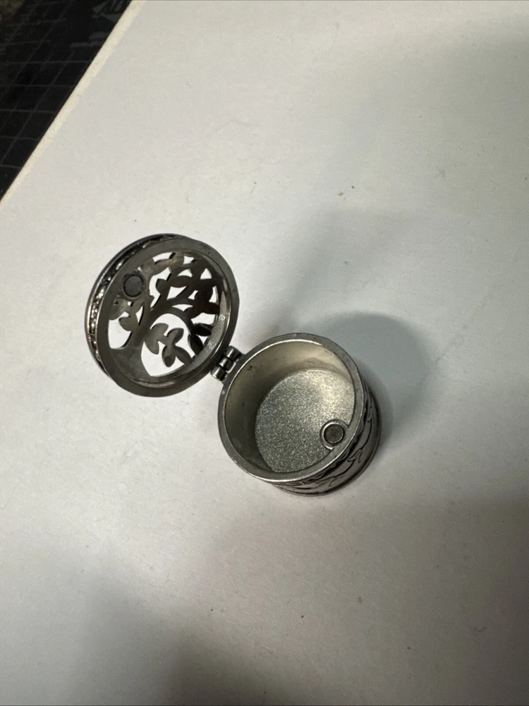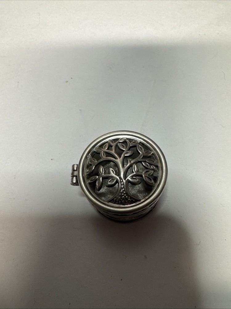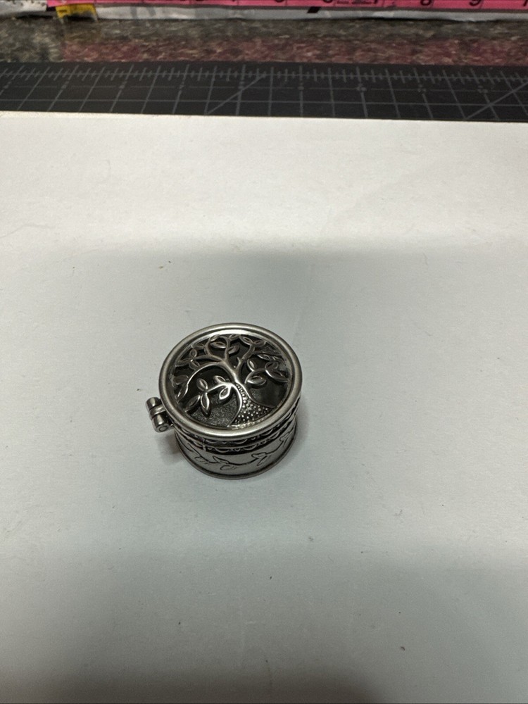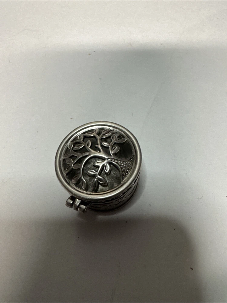 Collection: Keepsake Boxes Color: Silver Brand: Unbranded Type: Miniature Shape: Round Features: Boxed Finish: Silver Tone Pattern: tree Material: Metal Subject: Tree Closure Type: Magnetic