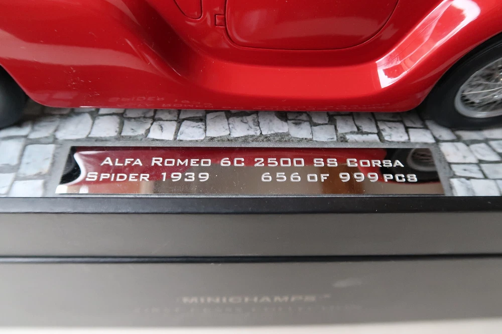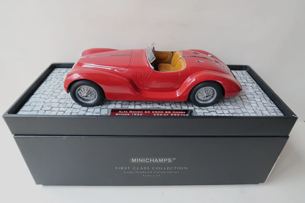 Minichamps , 1/18° Alfa Romeo 6C 2500SS Spider Corsa 1939 Série limitée First Class Collection , # 656/999 En etat neuf , modéle jamais exposé. Manque l'Essui Glace , et une petite vitre de custode. Le pare brise n'est pas collé à la voiture. Avec coffret d'origine est en excellent etat. Envoi soigné et rapide en colissimo recommandé uniquement . Alfa Romeo 6C 2500SS Spider Corsa 1939 Like new condition , never displayed. But it's missing the sweeper , and a small side window. Windshield is no more glued to the car . With original box , excellent condition . Fast and safe shipping . - Combine Shipping : I will gladly combine shipping charges where possible , and will refund additional shipping paid if the check out does not allow you to ask for it . (Except bulky , heavy or over 1000 value items) ANY QUESTION ? Just ask !