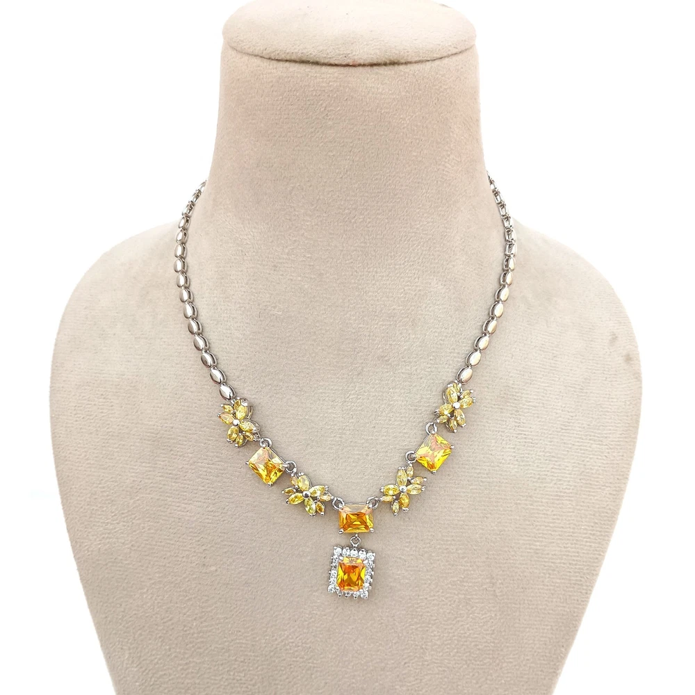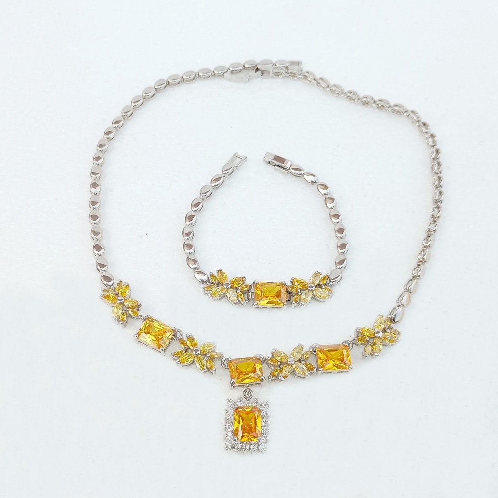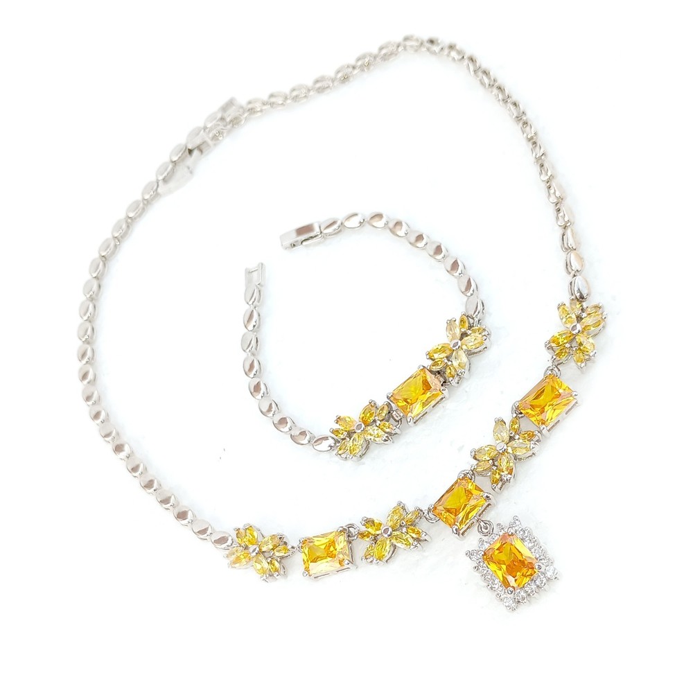 Base Metal: Brass Material: CitrinStone Theme: Princess Secondary Stone: Cubic Zirconia Color: Yellow Main Stone: Citrine Main Stone Creation: Simulated White Gold Plated Occasion: Prom Main Stone Shape: Square Country/Region of Manufacture: India Main Stone Treatment: Faceted Handmade: Yes Total Carat Weight: 45 grams Diamond Clarity Grade: Flawless (FL) Diamond Color Grade: AAA Set Includes: Earrings & Bracelet SKU-467 ✨ HIGH QUALITY: We take pride in crafting each piece by hand, using only the finest materials. Our products undergo rigorous sanitization processes to ensure your safety and satisfaction. ✨ DAZZLING: Our handmade necklace exudes a superior charm, effortlessly elevating your look for any occasion. Whether you're at the office or out for an evening event, its minimalist yet boho-inspired style complements every outfit with grace. ✨ OUR SERVICE: Your satisfaction is our priority. Should you have any questions or concerns, our dedicated team is here to assist you promptly. Expect a response within 24 hours, ensuring a seamless shopping experience. Indulge in the splendor of our Long Handmade Necklace, a timeless statement piece that embodies the beauty of Indian craftsmanship and style.