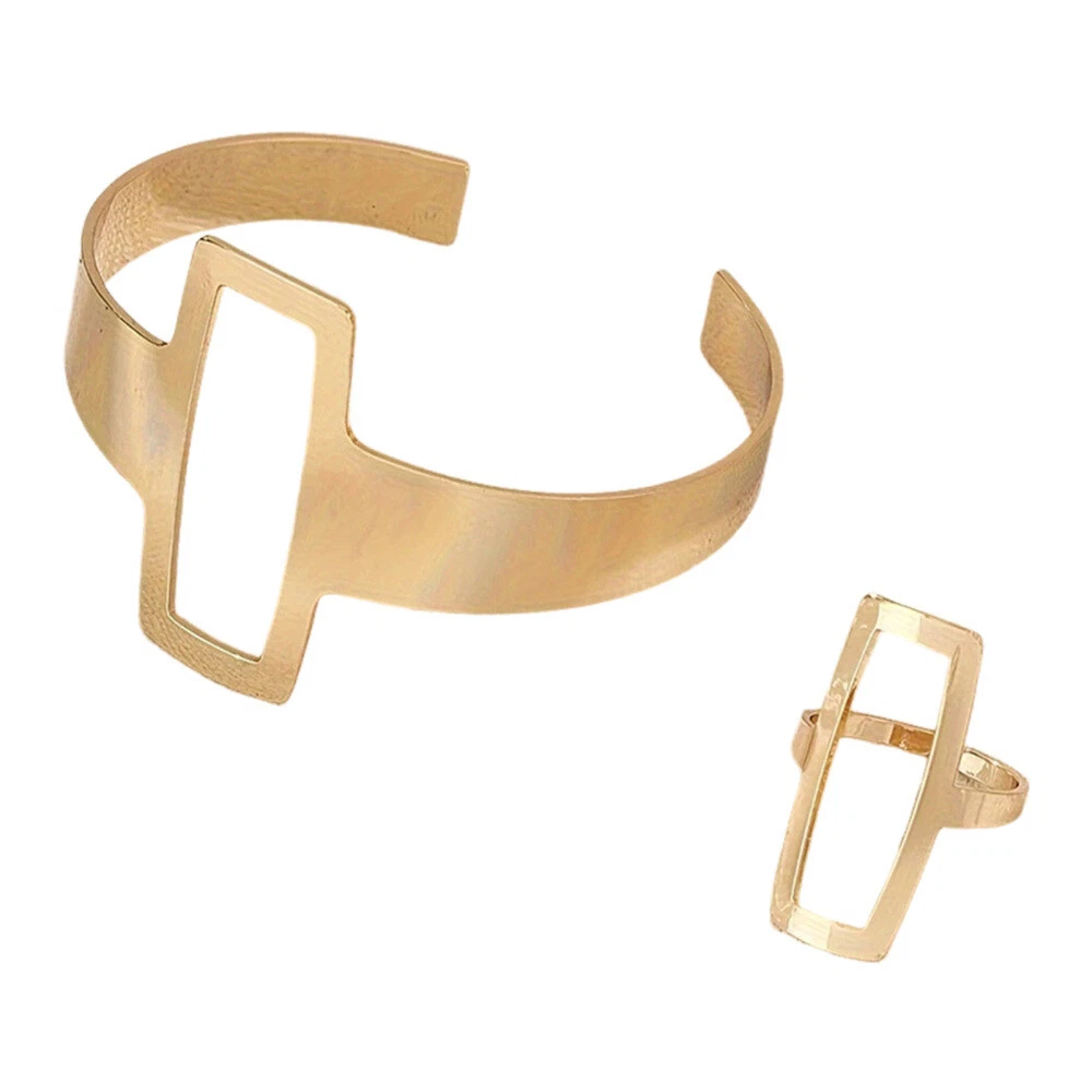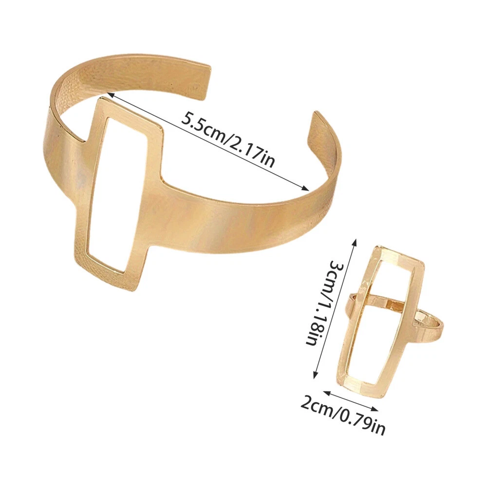 Features: Punk Style Cuff Bracelet Rings: Embrace the edgy and rebellious punk style with this set of cuff bracelet rings. Made from durable metal, these accessories feature intricate details and bold designs that will make a statement wherever you go. Geometrical Open Cuff Bangle with Ring: Add a touch of modern elegance to your ensemble with this geometrical open cuff bangle featuring a stylish ring. The sleek and minimalist design is perfect for those who appreciate clean lines and contemporary fashion. Exaggerated Metal Cuff Bracelet with Ring: Make a bold and daring fashion statement with this exaggerated metal cuff bracelet that comes with a matching ring. The eye-catching design and metallic finish will instantly elevate any outfit, making it perfect for special occasions or nights out. Simple Geometrical Style Alloy Open Cuff: Achieve a chic and trendy look with this simple yet stylish geometrical style alloy open cuff. The minimalist design and good-quality alloy material make it a versatile accessory that can be worn with both casual and formal attire. Heavy Punk Style Metal Open Bracelet Set: Channel your inner style with this heavy punk style metal open bracelet set. Crafted with attention to detail, these bold and chunky bracelets exudes a tough and rebellious vibe, making them a must-have for any punk fashion enthusiast. Specifications: Material: Alloy Bangle Diameter: 5.5cm Rings Size: 3*2cm Note: Due to the screen lighting effect, the actual color of the product may be slightly different. Due to manual measurement, please allow size error. Package includes: 1*Bangle 1*Ring