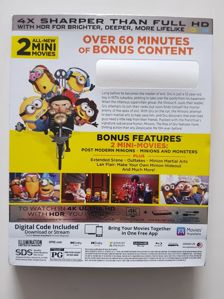 Sub-Genre: Animation/Anime gtin13: 0191329126486 UPC: 0191329126486 Country/Region of Manufacture: Mexico Number of Discs: 2 Item Width: 5.65 in Rating: PG Release Year: 2022 Genre: Family Run Time: 88 min. Format: Ultra HD Item Length: 6.77 in Studio: Universal Studios Movie/TV Title: Minions: The Rise of Gru Item Weight: 0.22 lb Item Height: 0.52 in Language: English