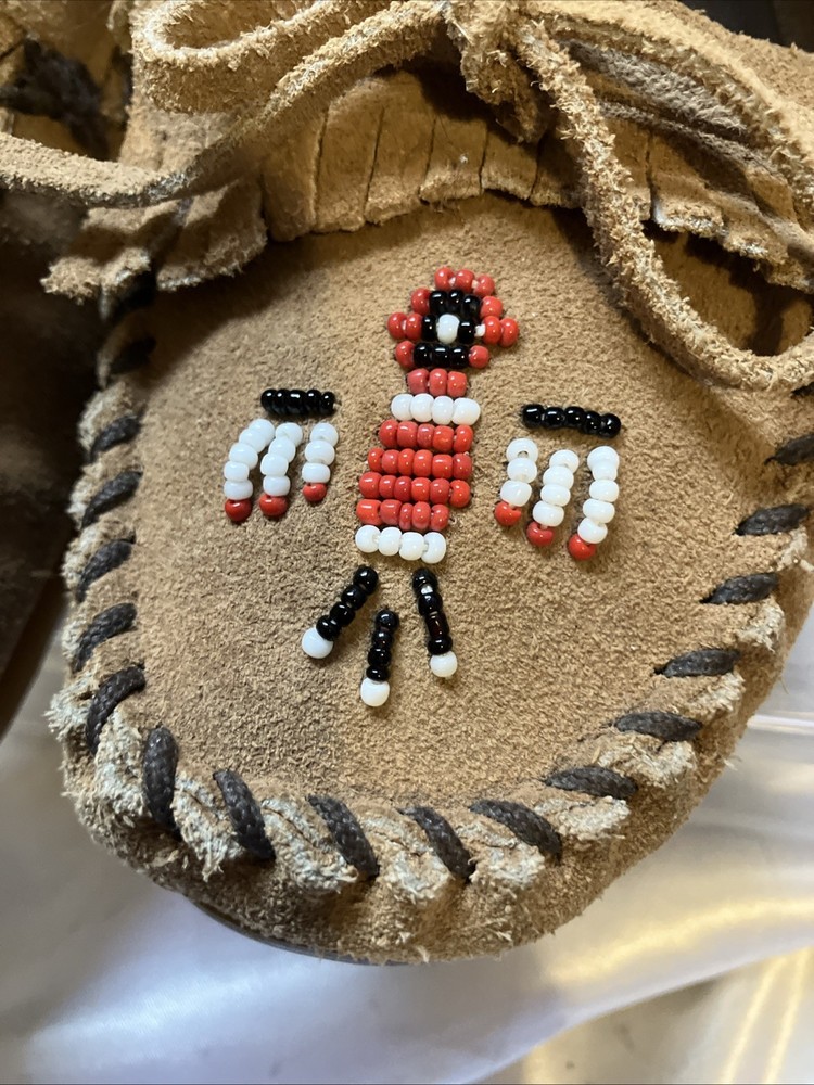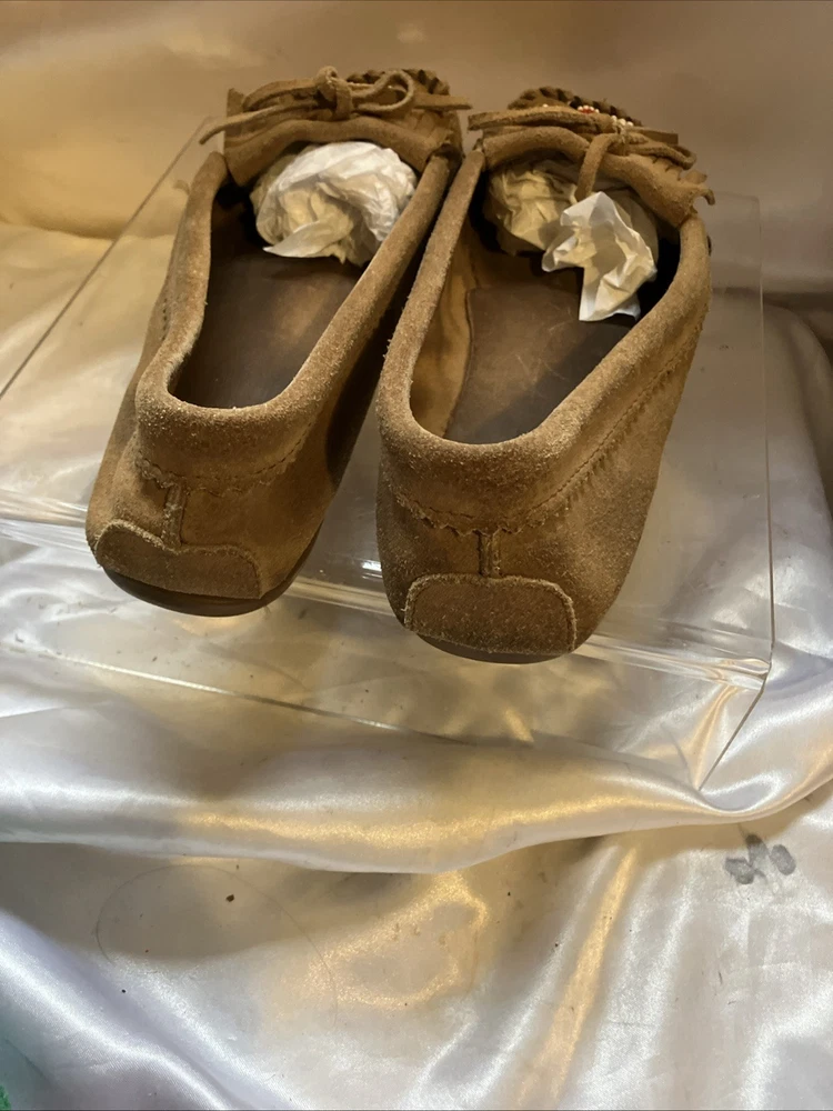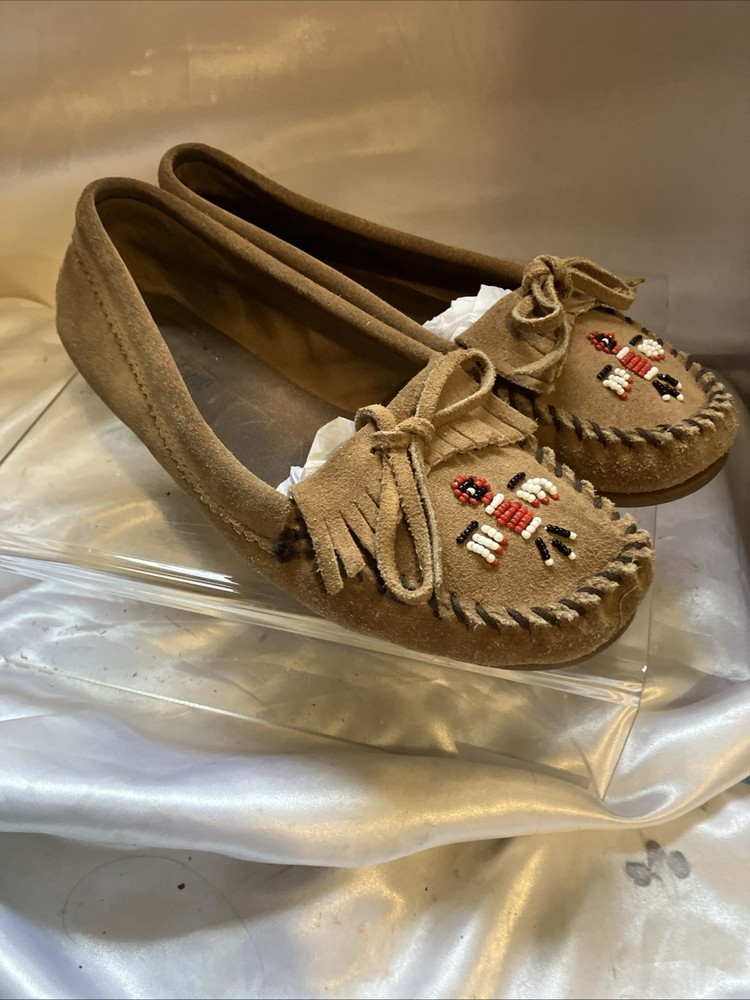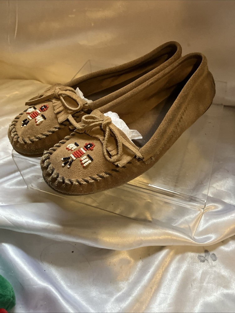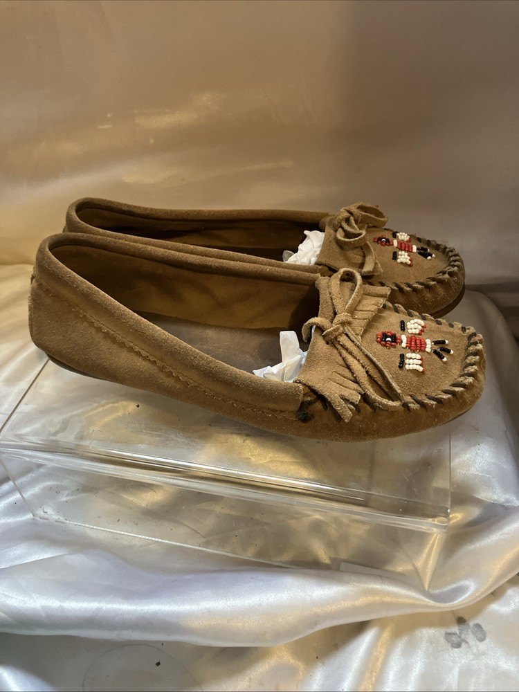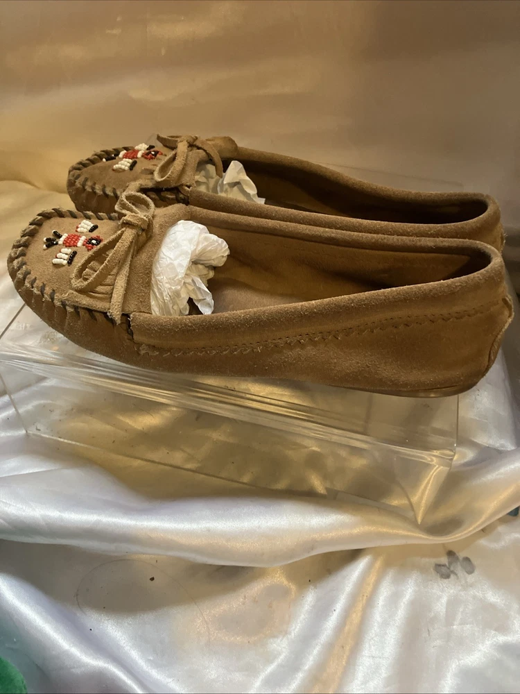 The Minnetonka Thunderbird Animikii Beaded Moccasins are a stylish and comfortable choice for women in size 11. Made of brown suede leather with beaded accents, these slip-on moccasins feature a round toe and standard shoe width. Perfect for various occasions such as travel, weddings, parties, casual outings, workwear, and business meetings, these lightweight and cushioned moccasins are breathable and easy to wear during the summer, fall, and spring seasons. Made in the United States by the reputable brand Minnetonka, these moccasins showcase a tribal and Native American theme, making them a unique and eye-catching addition to your footwear collection. Inside length is 10 1/2"