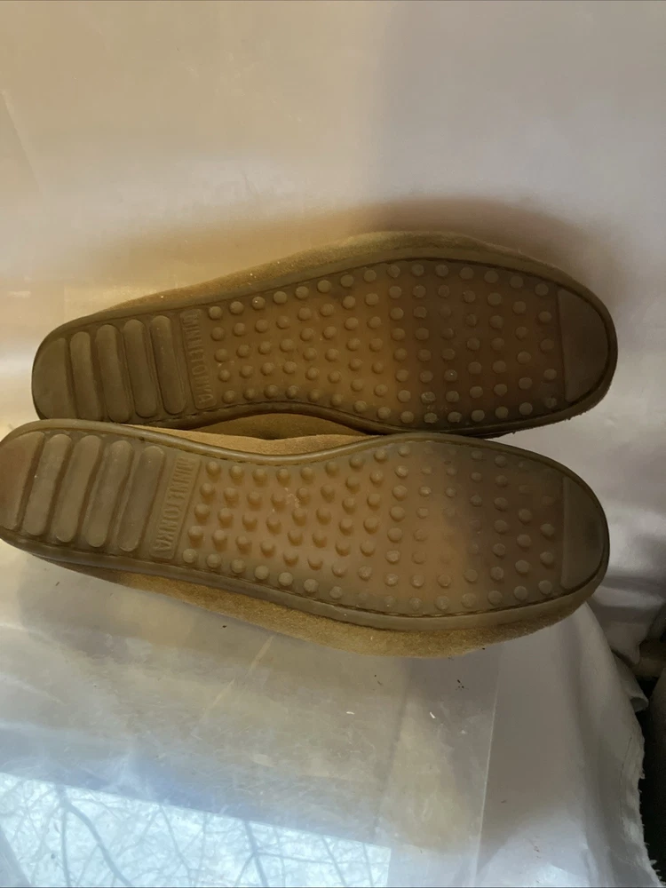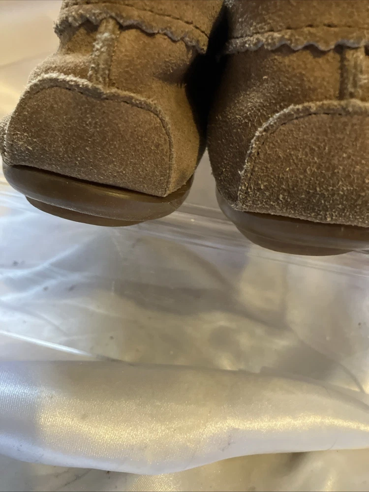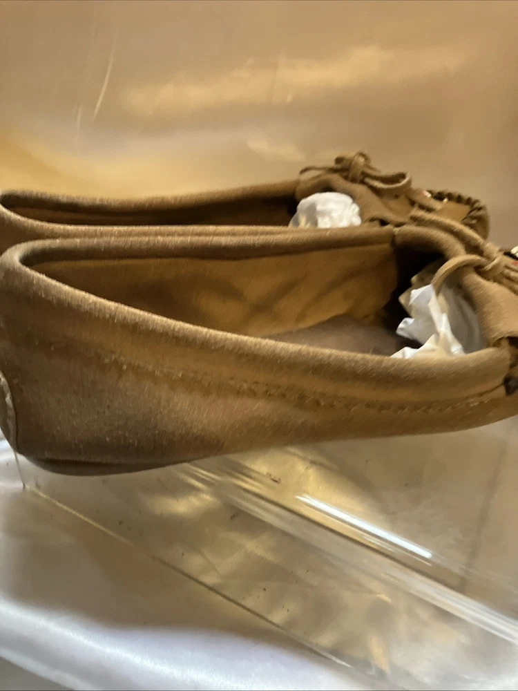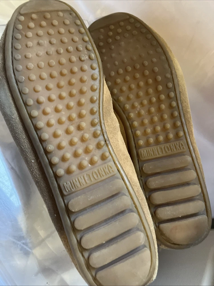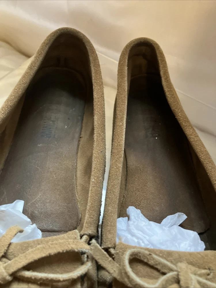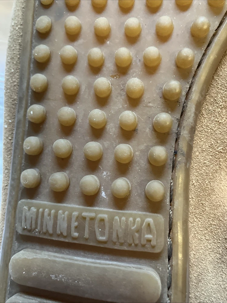 The Minnetonka Thunderbird Animikii Beaded Moccasins are a stylish and comfortable choice for women in size 11. Made of brown suede leather with beaded accents, these slip-on moccasins feature a round toe and standard shoe width. Perfect for various occasions such as travel, weddings, parties, casual outings, workwear, and business meetings, these lightweight and cushioned moccasins are breathable and easy to wear during the summer, fall, and spring seasons. Made in the United States by the reputable brand Minnetonka, these moccasins showcase a tribal and Native American theme, making them a unique and eye-catching addition to your footwear collection. Inside length is 10 1/2"