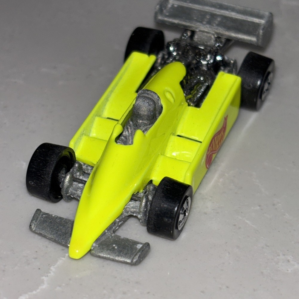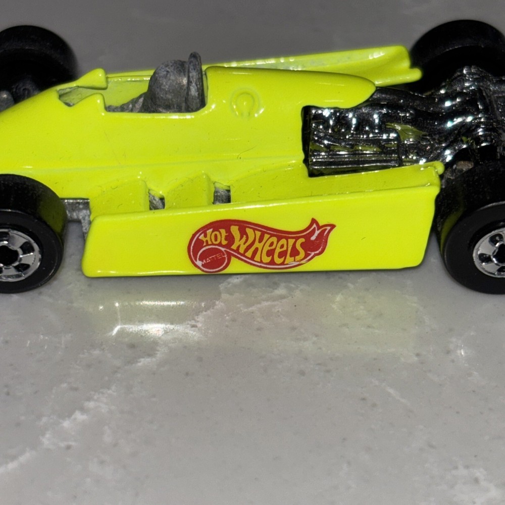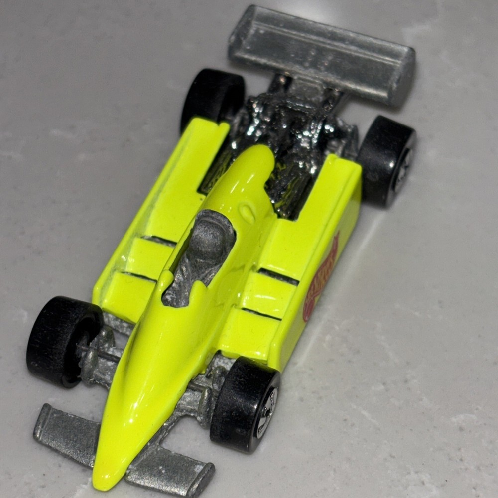 The item is a 1982 Hot Wheels diecast Indy race car in a vibrant neon green and yellow color scheme. This 1:64 scale model is part of the Hot Wheels Racing series and was manufactured in Malaysia. Featuring a classic design with no modifications, this collectible car is a part of the Cars character family and is ideal for vintage toy vehicle enthusiasts.