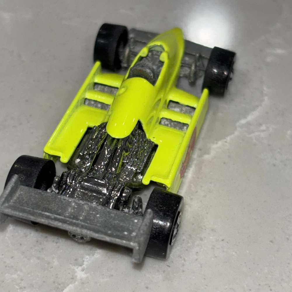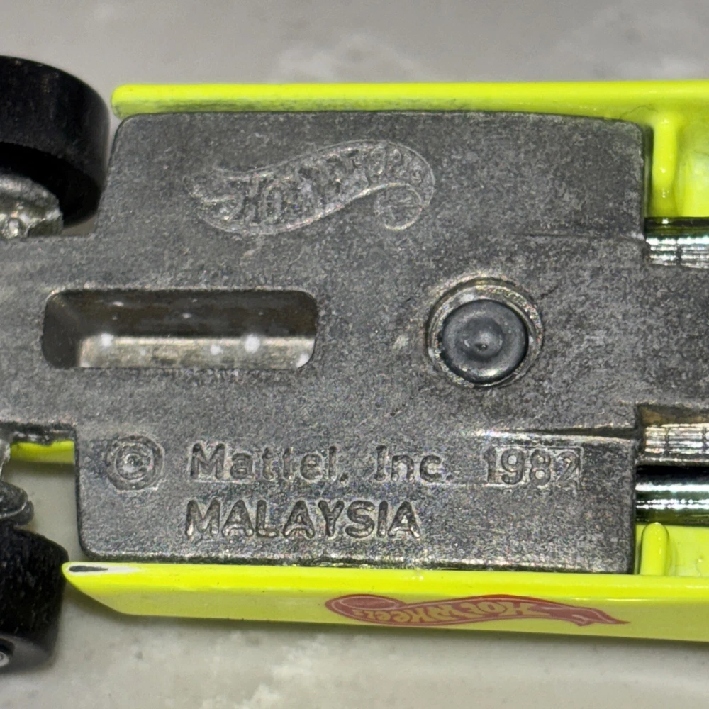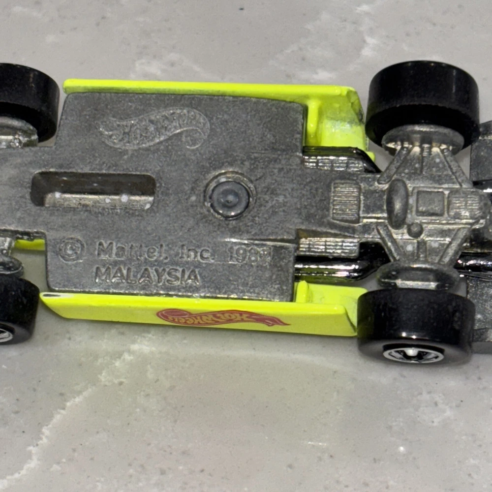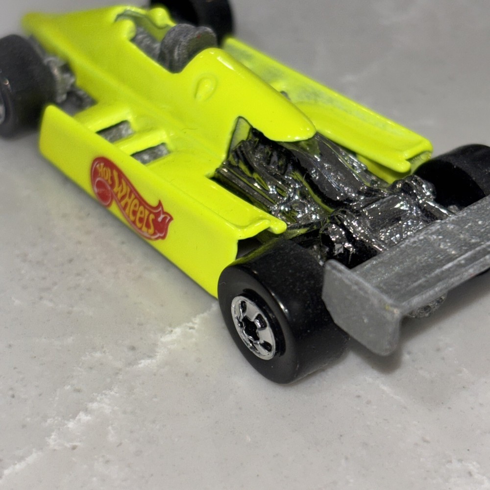 The item is a 1982 Hot Wheels diecast Indy race car in a vibrant neon green and yellow color scheme. This 1:64 scale model is part of the Hot Wheels Racing series and was manufactured in Malaysia. Featuring a classic design with no modifications, this collectible car is a part of the Cars character family and is ideal for vintage toy vehicle enthusiasts.