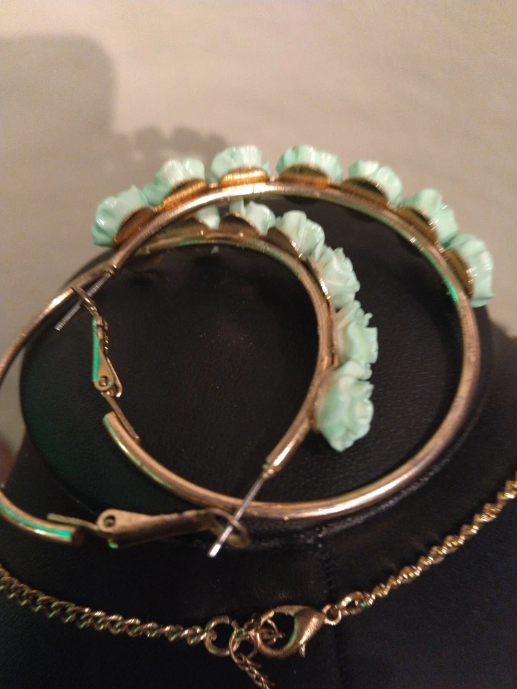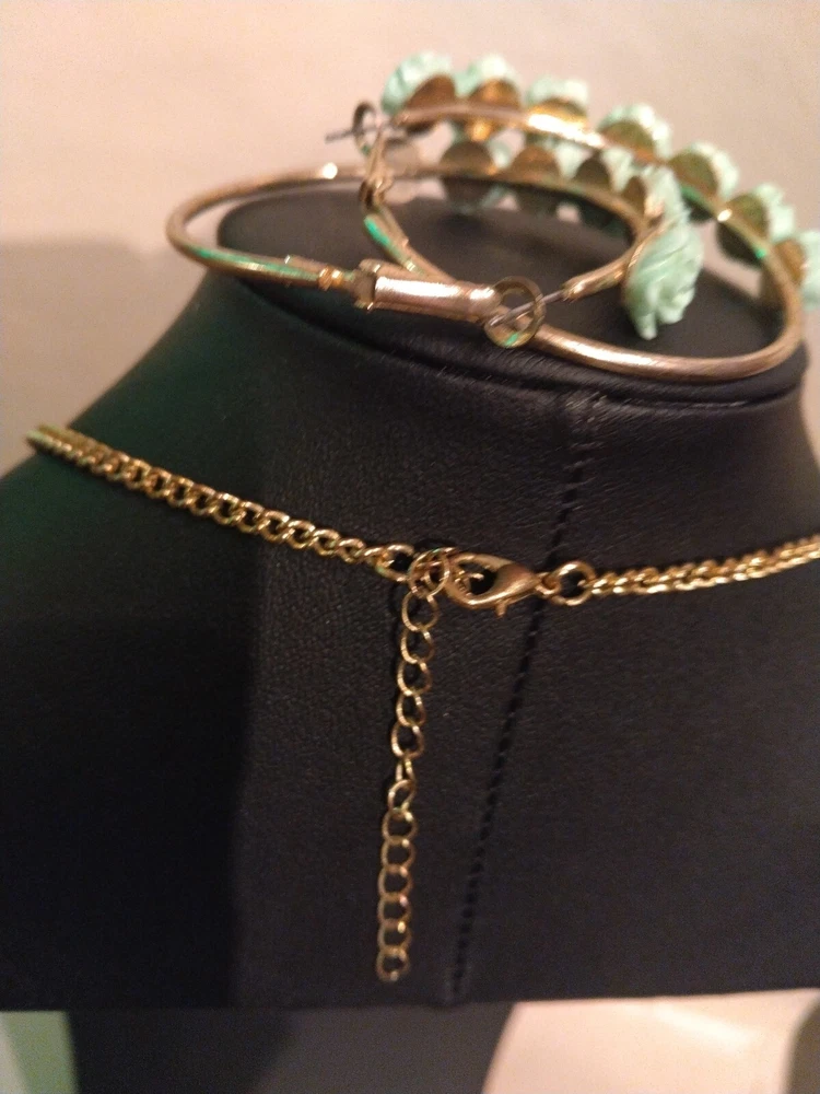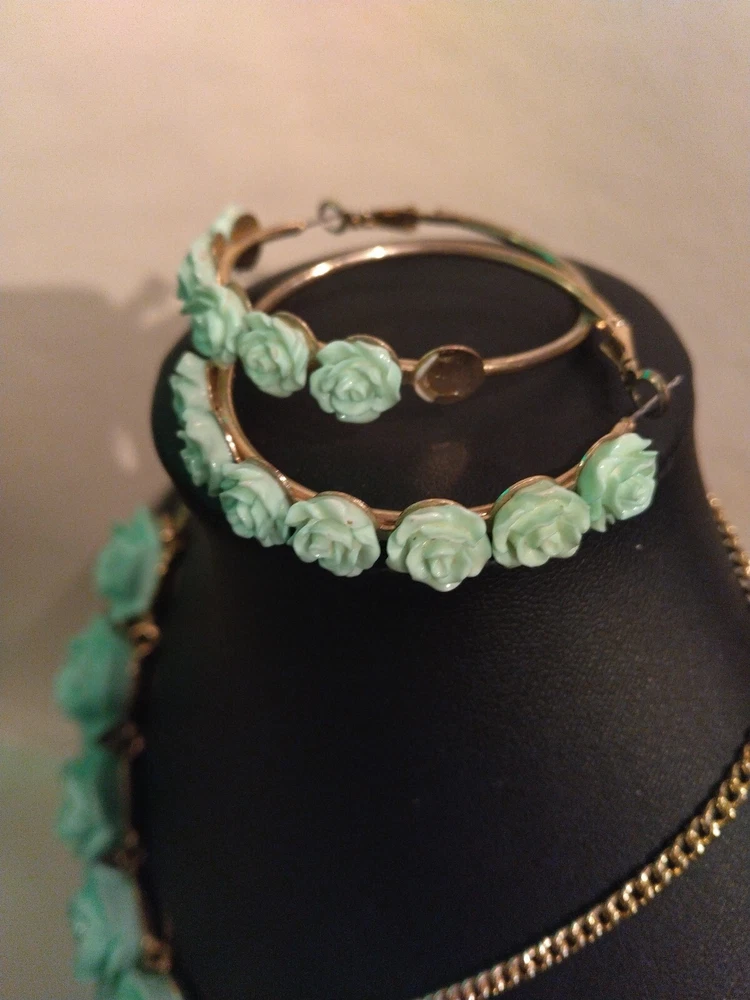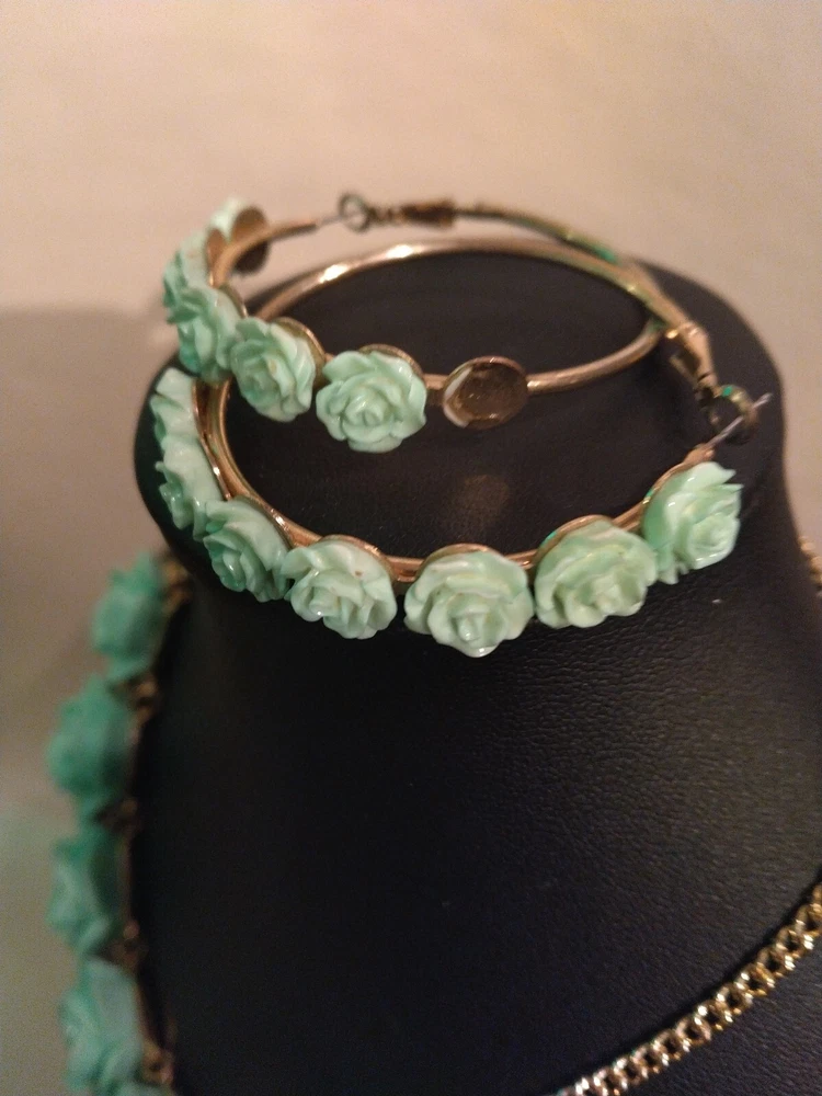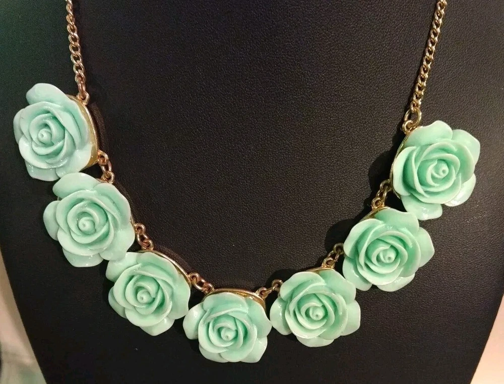 This mint green carved flower bib necklace is the perfect accessory for any occasion. The necklace is made of resin and gold tone metal cable chain, with a lobster closure and extender. The 7 flower pendants have exquisite detail and the necklace is nickel-free and stackable. The necklace is 16 inches in length, with an 2"extender for adjustable comfort. The necklace comes with matching hoop earrings for a complete look. One of the earrings is missing a flower at the bottom. Please see photos for exact condition. All offers considered and I will combine shipping on multiple orders. Thanks for looking!