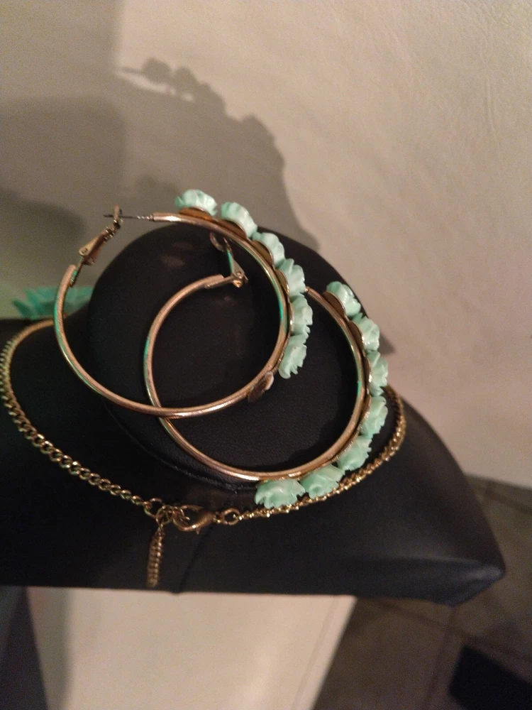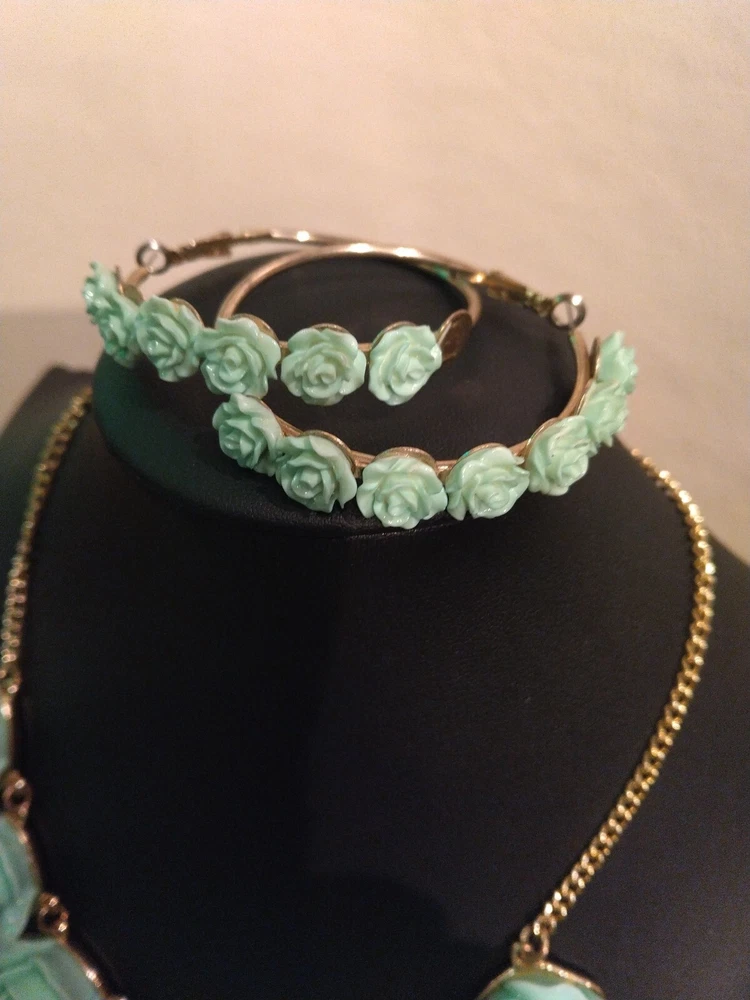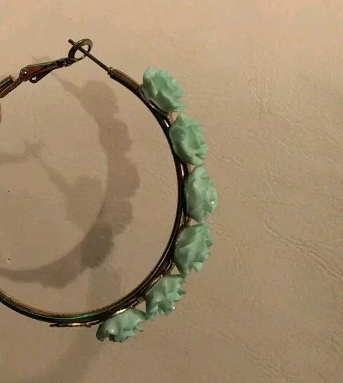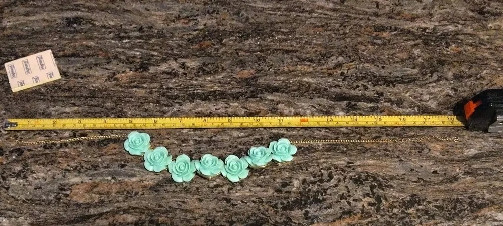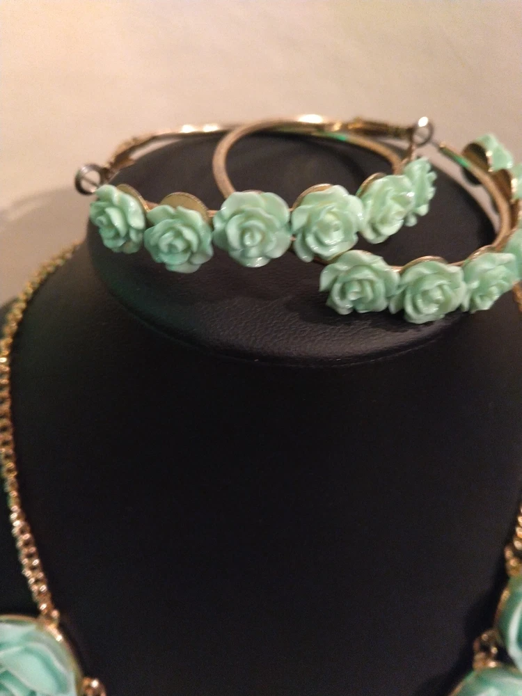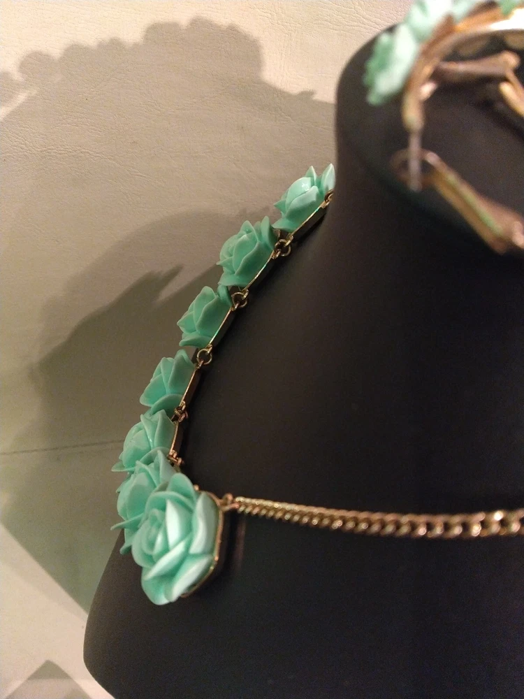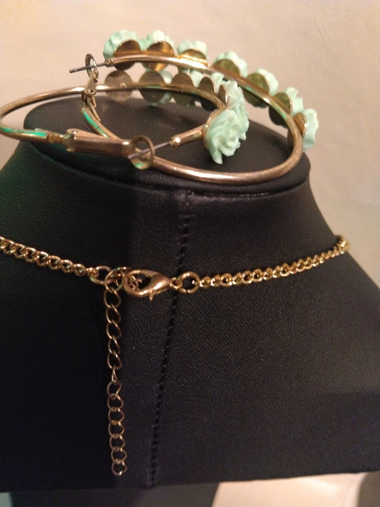 This mint green carved flower bib necklace is the perfect accessory for any occasion. The necklace is made of resin and gold tone metal cable chain, with a lobster closure and extender. The 7 flower pendants have exquisite detail and the necklace is nickel-free and stackable. The necklace is 16 inches in length, with an 2"extender for adjustable comfort. The necklace comes with matching hoop earrings for a complete look. One of the earrings is missing a flower at the bottom. Please see photos for exact condition. All offers considered and I will combine shipping on multiple orders. Thanks for looking!