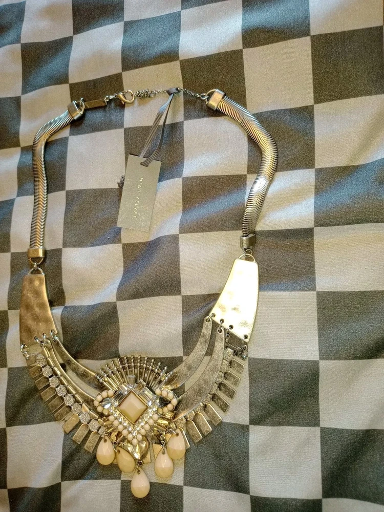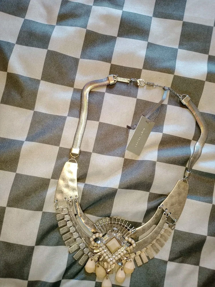 Mint velvet ladies statement silver necklace with pinky beige stones and crystal, 34 CMS in length, adjustable, hammered finish, brand new item with tags