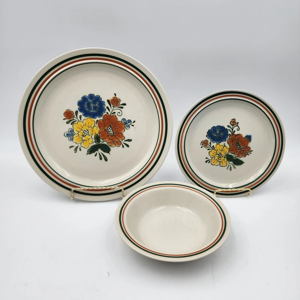 The Mioko Newcor Designer Collection 151 is a vintage set of dinner and salad plates and bowls. Made in Japan in the 1970s; these stoneware items are durable and in excellent condition. These pieces are microwave, oven, and dishwasher safe. The plates feature a hand painted mid-century design of colorful flowers. There are 3 selections for purchase: 6 dinner plates measuring 10.5" 7 salad plates measuring 7" 4 bowls measuring 7"