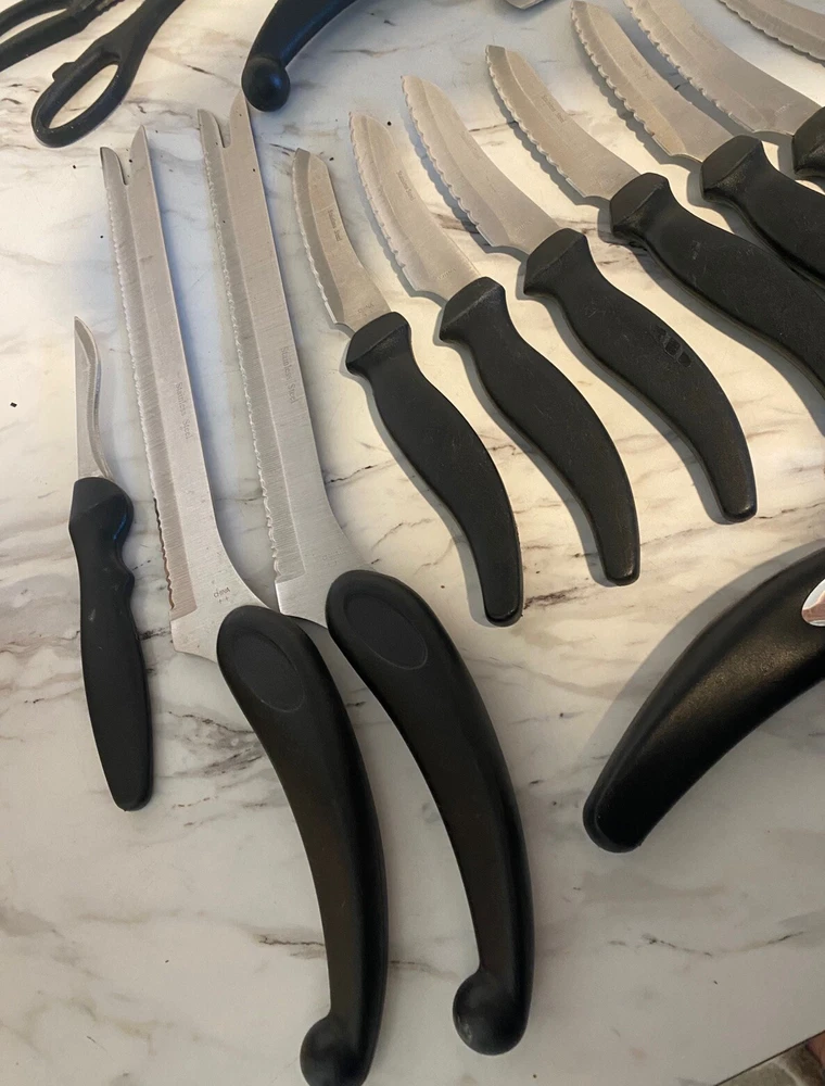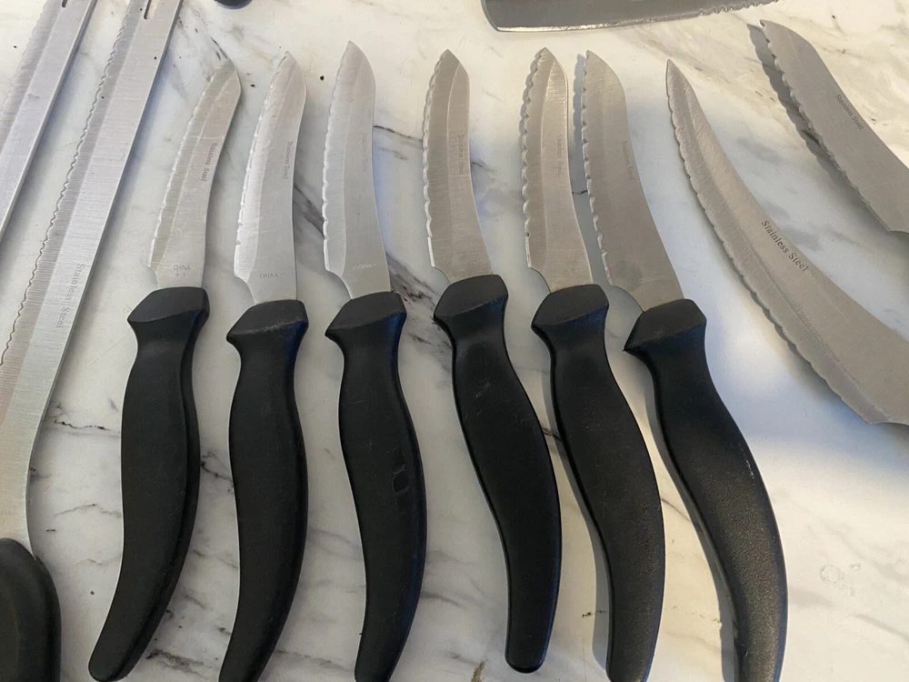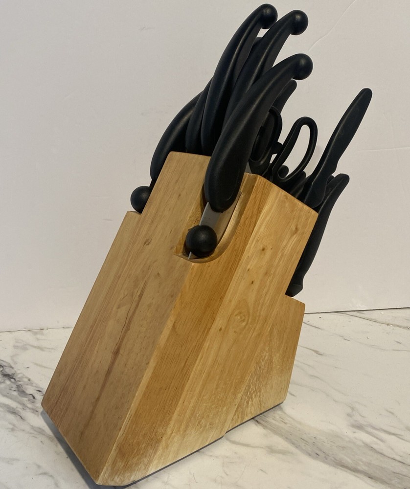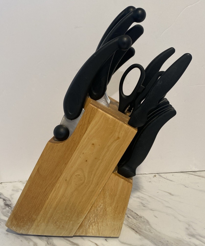 Brand: Miracle Blade Material: Plastic, Stainless Steel Color: Black Handle Material: Composite Blade Edge: Mixed Set Includes: Carving & Slicing Knives, Knife Set, Serrated Knife, Steak Knife, Wood Block Type: Knife Set Number of Items in Set: 15